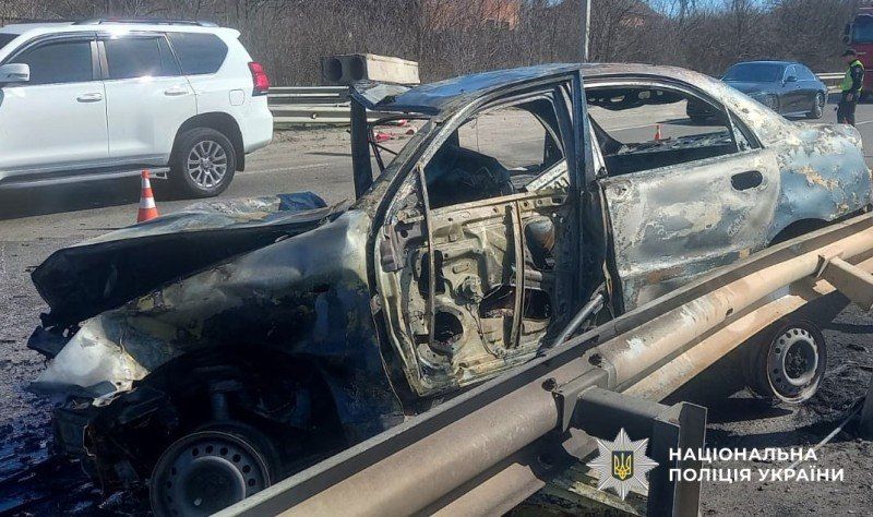 За попередньою інформацією поліції, автомобіль Daewoo Lanos під час руху зіткнувся з відбійником, після чого транспортний засіб загорівся.