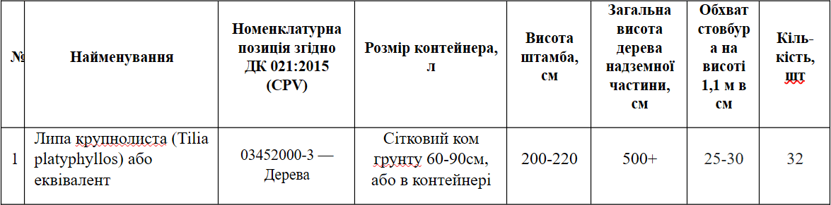 Відповідно до інформації Prozorro, замовник висуває суворі вимоги до параметрів рослин: це мають бути вже сформовані дерева загальною висотою надземної частини понад 5 метрів із висотою штамба 2-2,2 метри та обхватом стовбура на висоті 1,1 метра від 25 до 30 сантиметрів.