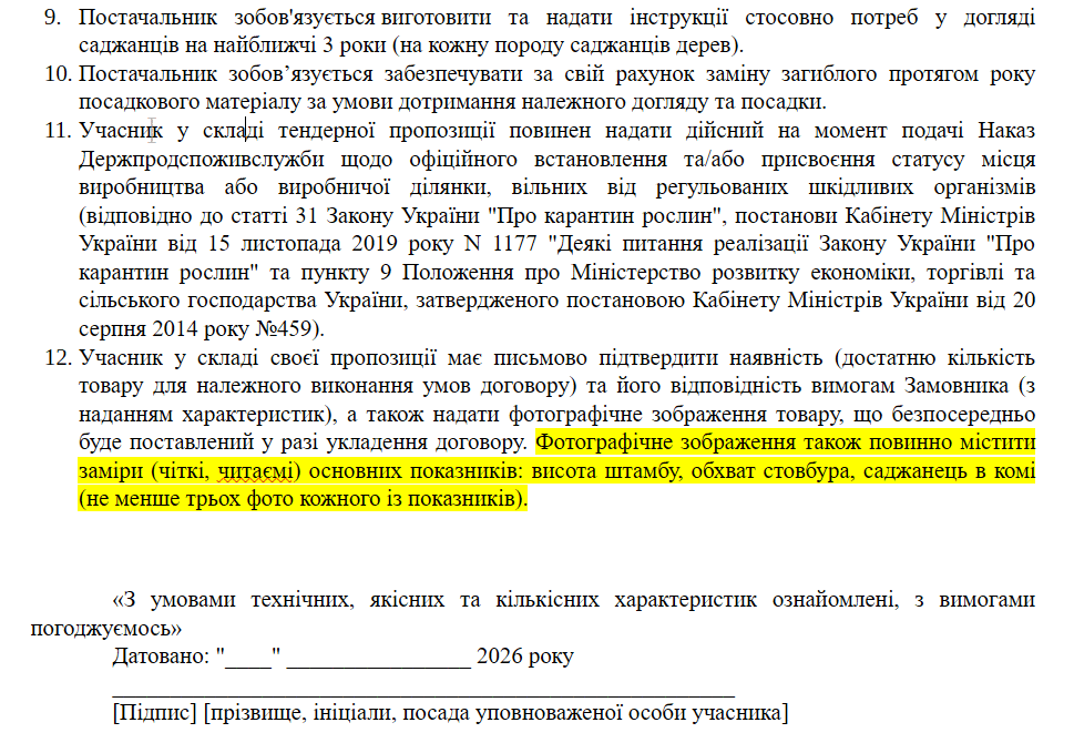 При цьому ще на етапі подання тендерної пропозиції замовник вимагає надати не менше трьох фотографій дерев із чіткими замірами, зокрема обов'язково зафіксувати саджанець вже у сформованому комі ґрунту. Оскільки такі великі дерева зазвичай викопують безпосередньо перед транспортуванням для збереження їхньої життєздатності, ця вимога є технічно складною для тих розсадників, чиї дерева зараз ростуть у полі, і надає перевагу тим постачальникам, які вже мають підготовлений або імпортований товар на своїх майданчиках.