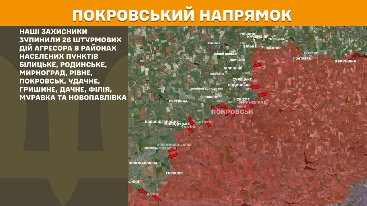 На Покровському напрямку наші захисники зупинили 26 штурмових дій агресора в районах населених пунктів Білицьке, Родинське, Мирноград, Рівне, Покровськ, Удачне, Гришине, Дачне, Філія, Муравка та Новопавлівка.