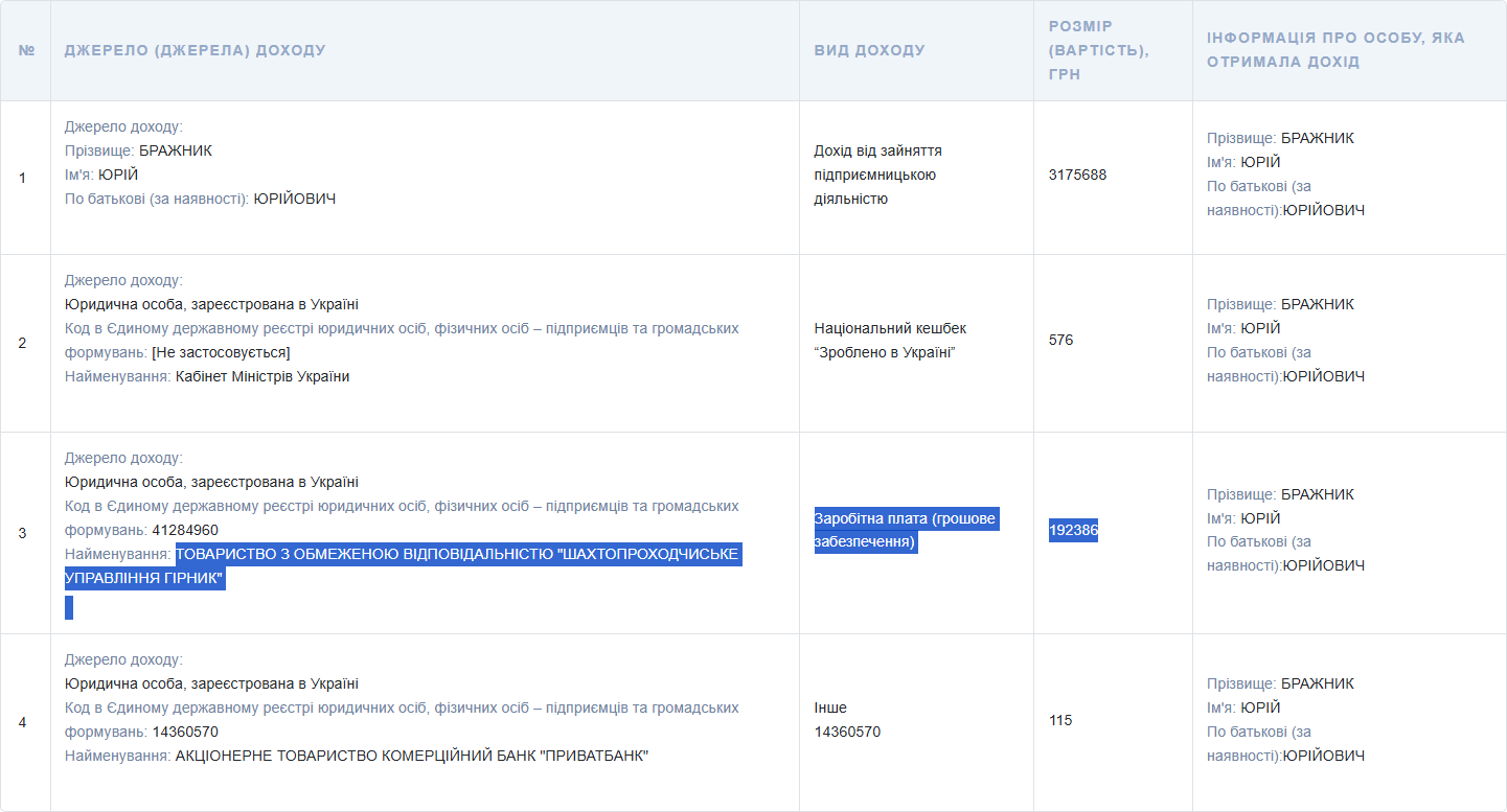 За минулий рік депутат отримав там 192 тис. грн зарплати. Юрій Бражник у відповідь коротко згадав про свій трудовий шлях: