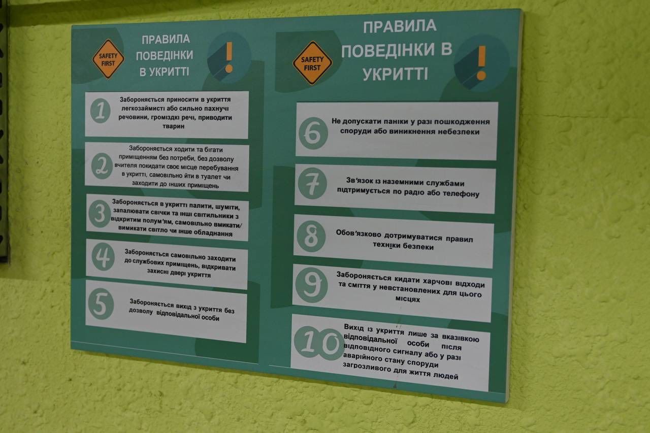 Саме укриття відповідає всім сучасним вимогам безпеки та інклюзії. Працює потужна вентиляція, є кухня та санітарні приміщення з урахуванням потреб людей з інвалідністю, а також окремі простори для індивідуальних занять. В укритті є пожежна сигналізація та необхідні умови для комфортного перебування дітей і дорослих.