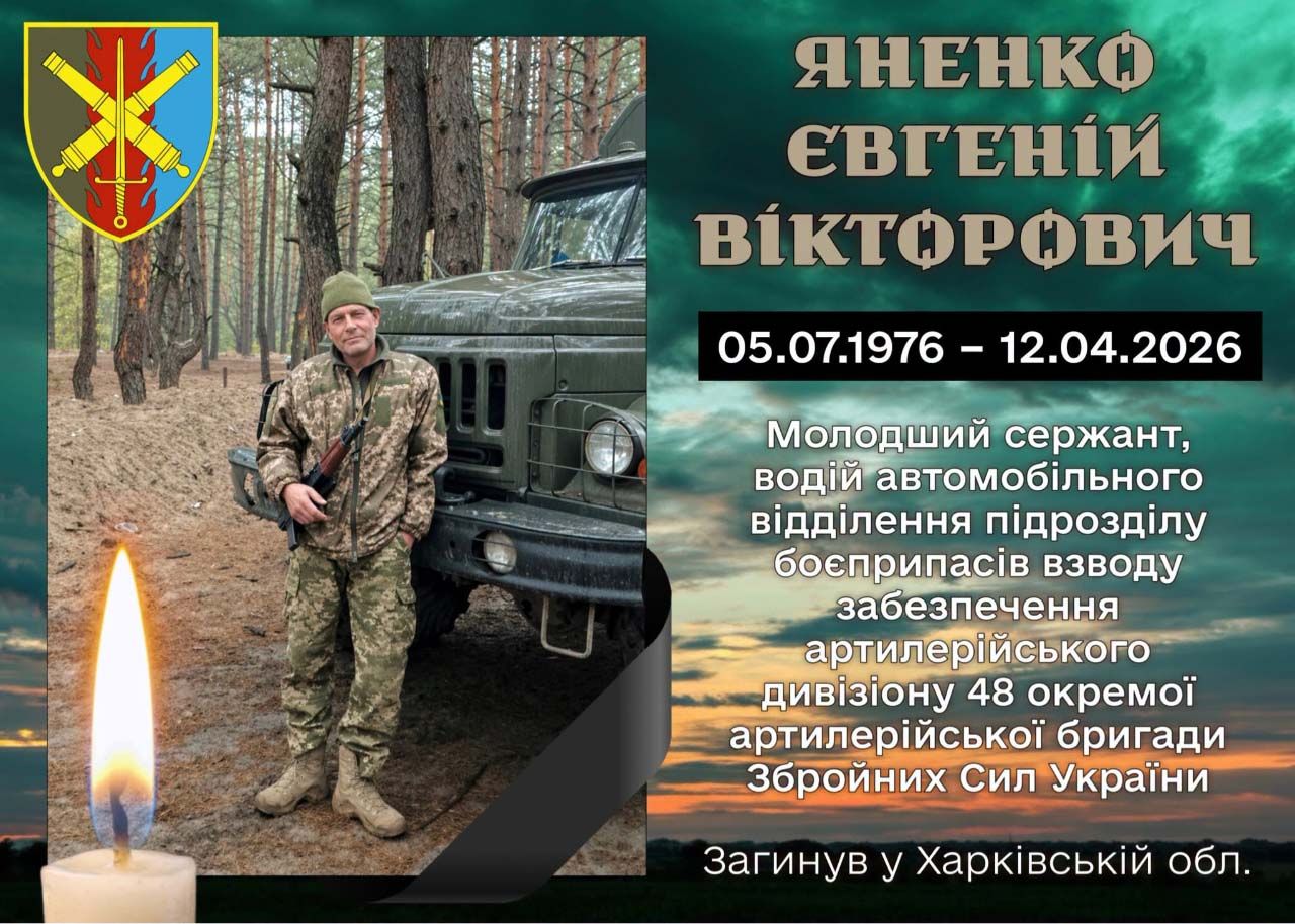 За інформацією Хорольської міської ради, 12 квітня 2026 року під час виконання військового обов’язку в Чугуївському районі Харківської області загинув Яненко Євгеній Вікторович — молодший сержант, водій автомобільного відділення підрозділу боєприпасів взводу забезпечення артилерійського дивізіону 48-ї окремої артилерійської бригади.
