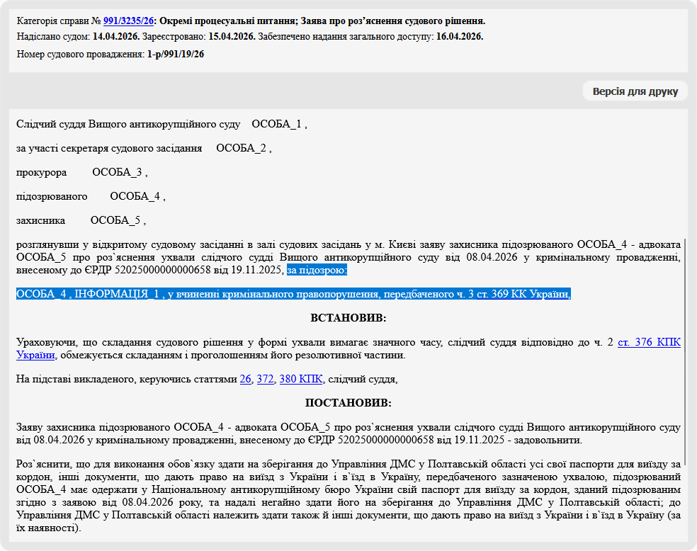 Донедавна імена фігурантів лунали лише в контексті обшуків та вилучення телефонів. Однак 14 квітня ВАКС оприлюднив ухвалу, з якої випливає, що у справі з’явився перший офіційний підозрюваний (йому інкримінують ч. 3 ст. 369 КК України — пропозиція, обіцянка або надання неправомірної вигоди).