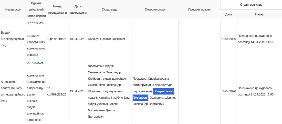 Завдяки інформації з розкладу судових засідань Апеляційної палати ВАКС стало відомо, що цей підозрюваний — 50-річний Віктор Григорович Прядка. Відомо, що його інтереси в суді представляє адвокат Олександр Шевчик.