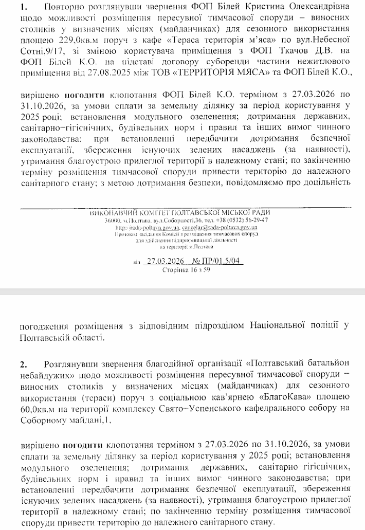 Аналогічне рішення ухвалили і щодо соціальної кав'ярні «БлагоКава» (БО «Полтавський батальйон небайдужих»). Комісія погодила розміщення тераси площею 60 кв.м на території комплексу Свято-Успенського кафедрального собору (Соборний майдан, 1) також до кінця жовтня 2026 року.