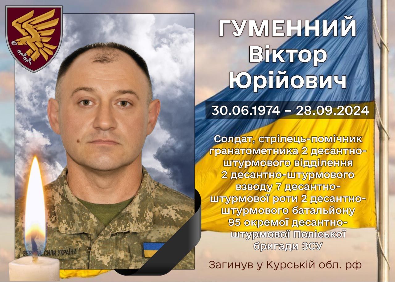 За інформацією Хорольської міської ради, 28 вересня 2024 року під час виконання бойового завдання в районі селища Медвежжя Глушковського району Курської області Російської Федерації загинув Гуменний Віктор Юрійович — солдат, стрілець-помічник гранатометника 95-ї окремої десантно-штурмової Поліської бригади.