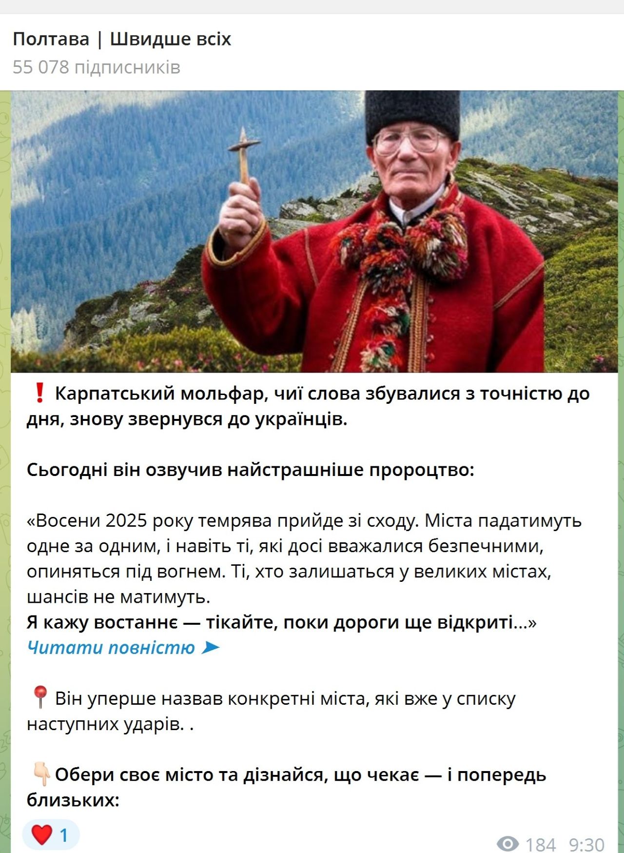 Зокрема, на неофіційному пабліку про відключення світла «єСвітло Полтавська область» повідомляли про неіснуючі списки відключення світла, натомість рекламували канал «Швидше всіх», видаючи посилання на нього за списки відключень по областям України. Або ж практично в перші секунди після вибухів, які лунали на Полтавщині, публікували, як, до прикладу, телеграм-канал «Доброго вечора, ми з Полтави», дописи з текстом «Пряме включення з Кременчука — головні кадри, наслідки атаки». Так зване «пряме включення» вело на паблік «Труха Кременчук». Як маніпулювали полтавцями телеграм-канали ще? Повідомляли про нібито оновлені графіки світла, за якими насправді була реклама анонімного каналу «Сірий кардинал». Також за публікаціями про передбачення мольфара також була реклама сумнівного анонімного каналу.