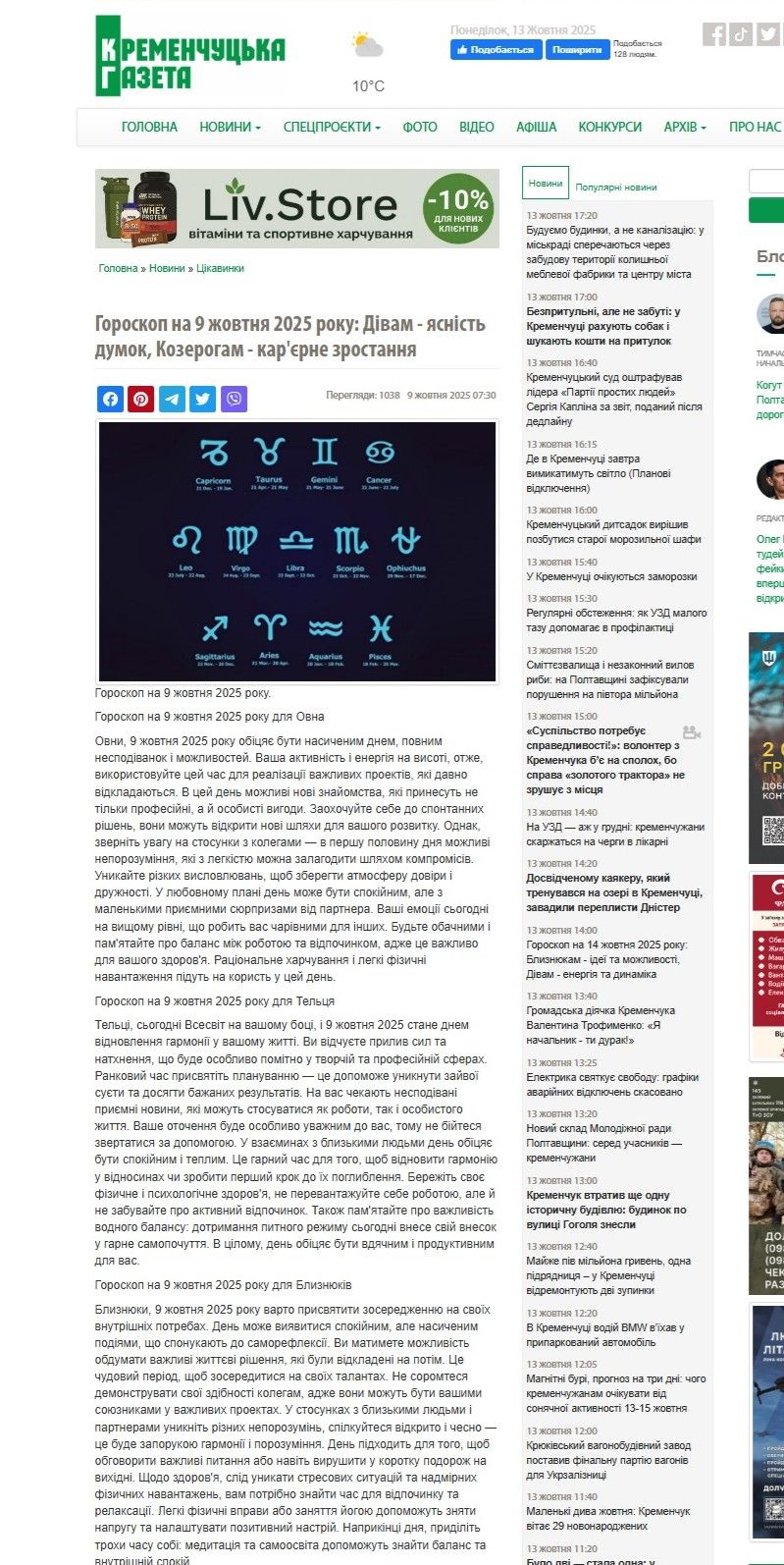 Астрології дещо поменшало, в порівнянні з минулим моніторингом. Сайт новин «Полтава24», на якому є навіть рубрика «Астрологія», минулого тижня зменшив кількість публікацій в рубриці. Також новини з гороскопами ми зафіксували на сайті «Кременчуцької газети».