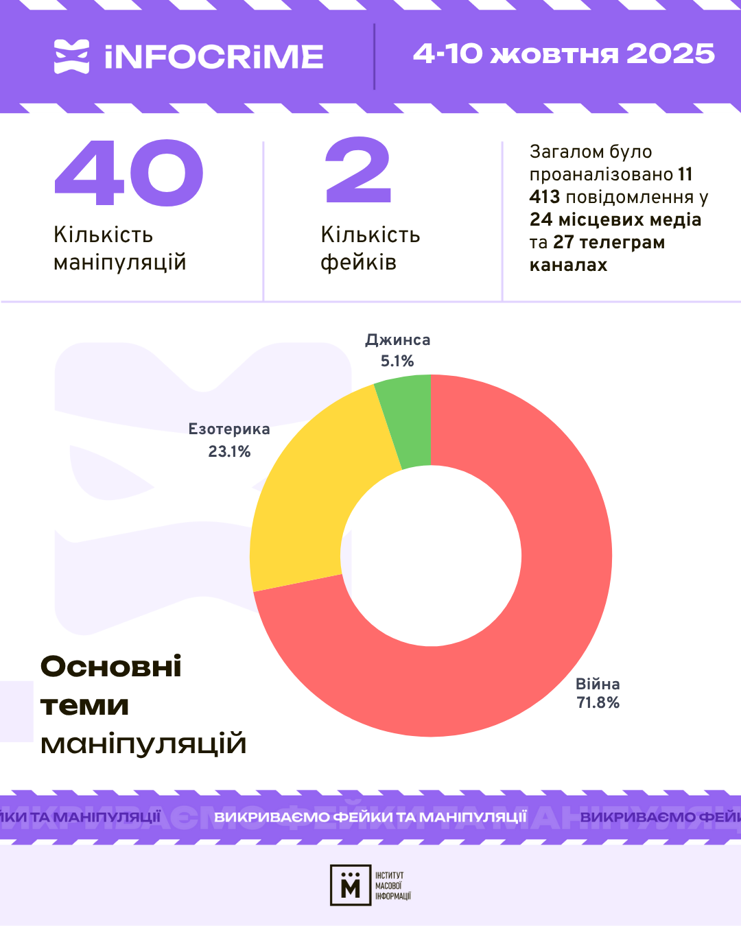 Маніпуляцій темою війни на телеграм-каналах стало ще більше, а от астрології і гороскопів у медіа — поменшало. «InfoCrime Poltava» продовжує аналізувати популярні медіа та пабліки Полтавщини і розповідати як маніпулюють читачами. До вашої уваги щотижневий дайджест основних тенденцій, які ми побачили протягом моніторингу протягом 4-10 жовтня.