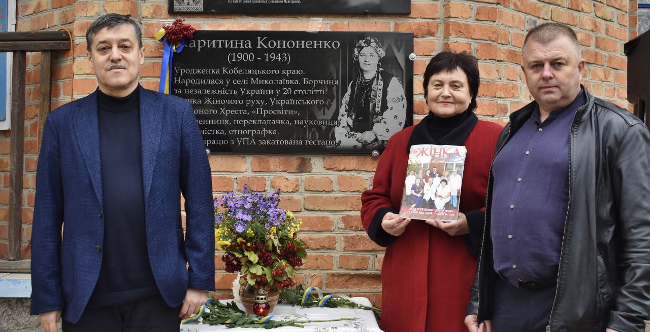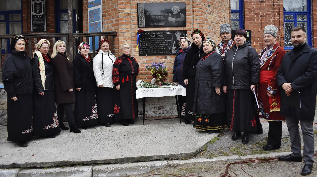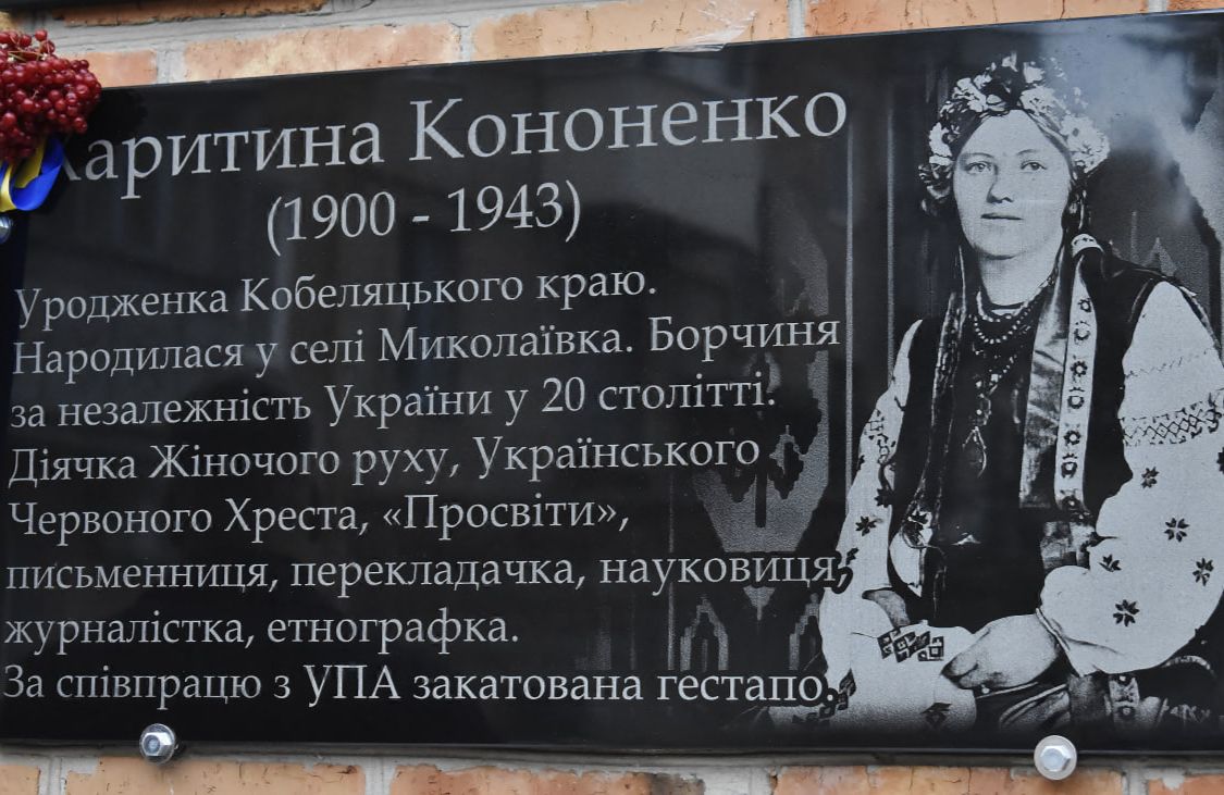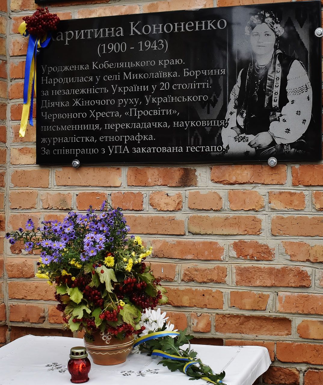 За ініціативи Українського інституту національної пам’яті (УІНП) 18 жовтня у місті Кобеляки Полтавського району урочисто відкрили меморіальну дошку на пошану учасниці українського визвольного руху ХХ століття Харитини Кононенко, дитинство якої минуло у селі Миколаївка Кобеляцького повіту Полтавщини. Церемонію відкриття присвятили 125-річчю від дня народження діячки волонтерського руху з підтримки Української повстанської армії (УПА), Українського Червоного Хреста і жіночих організацій. А ще Харитина Кононенко як письменниця, публіцистка, науковиця, перекладачка, діячка «Просвіти», етнографка і журналістка зробила вагомий внесок в українські літературу і мистецтво. Тож виконком Кобеляцької міської ради створив нове місце пам’яті у громаді саме на фасаді будівлі Кобеляцького музею літератури та мистецтва.