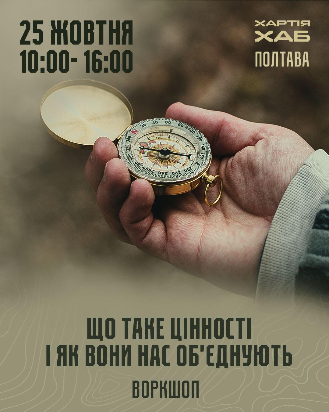 25 жовтня, о 10:00 у Полтаві в «Хартія-Хаб», просвітницькому просторі 2 корпусу «Хартія» де єднаються військові та цивільні відбудеться воркшоп «Що таке цінності і як вони нас об’єднують»