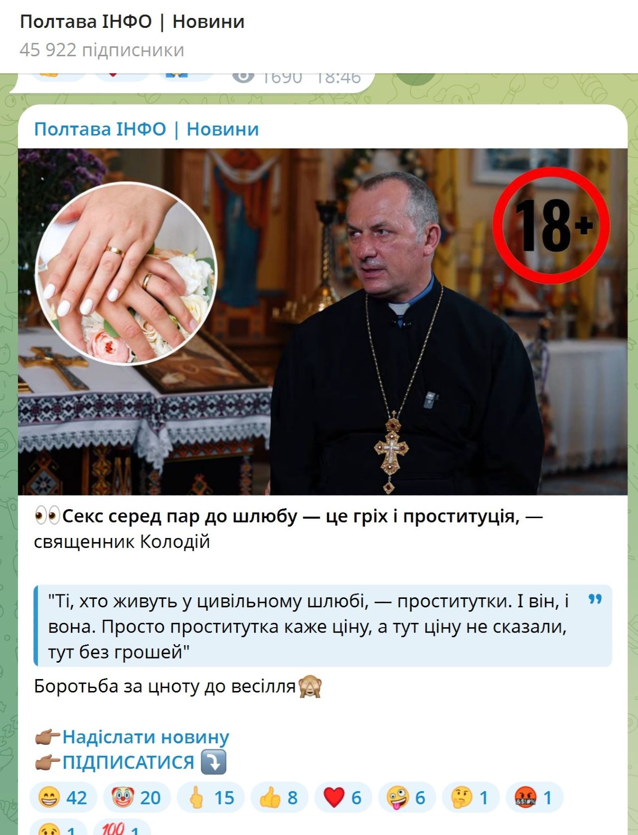 Телеграм-канал «Полтава ІНФО | Новини», який позиціонує свій контент як «важливі та актуальні новини Полтавщини», опублікував цитату священника-блогер Василя Колодія, де він називає секс до шлюбу гріхом і проституцією, вдаючись до маніпулятивних узагальнень «хто живуть у цивільному шлюбі, — проститутки».