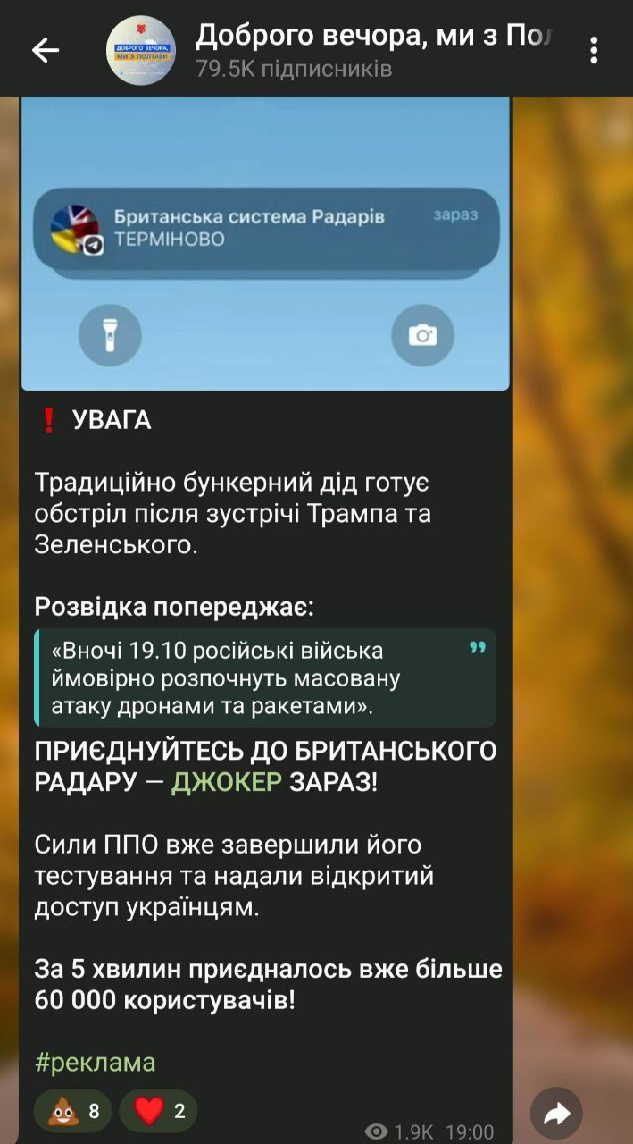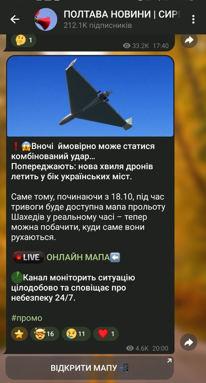 Телеграм-канали традиційно залучають підписників, публікуючи фіктивні графіки відключення світла, моніторингові канали, мапи «де видно шо куди летить»,