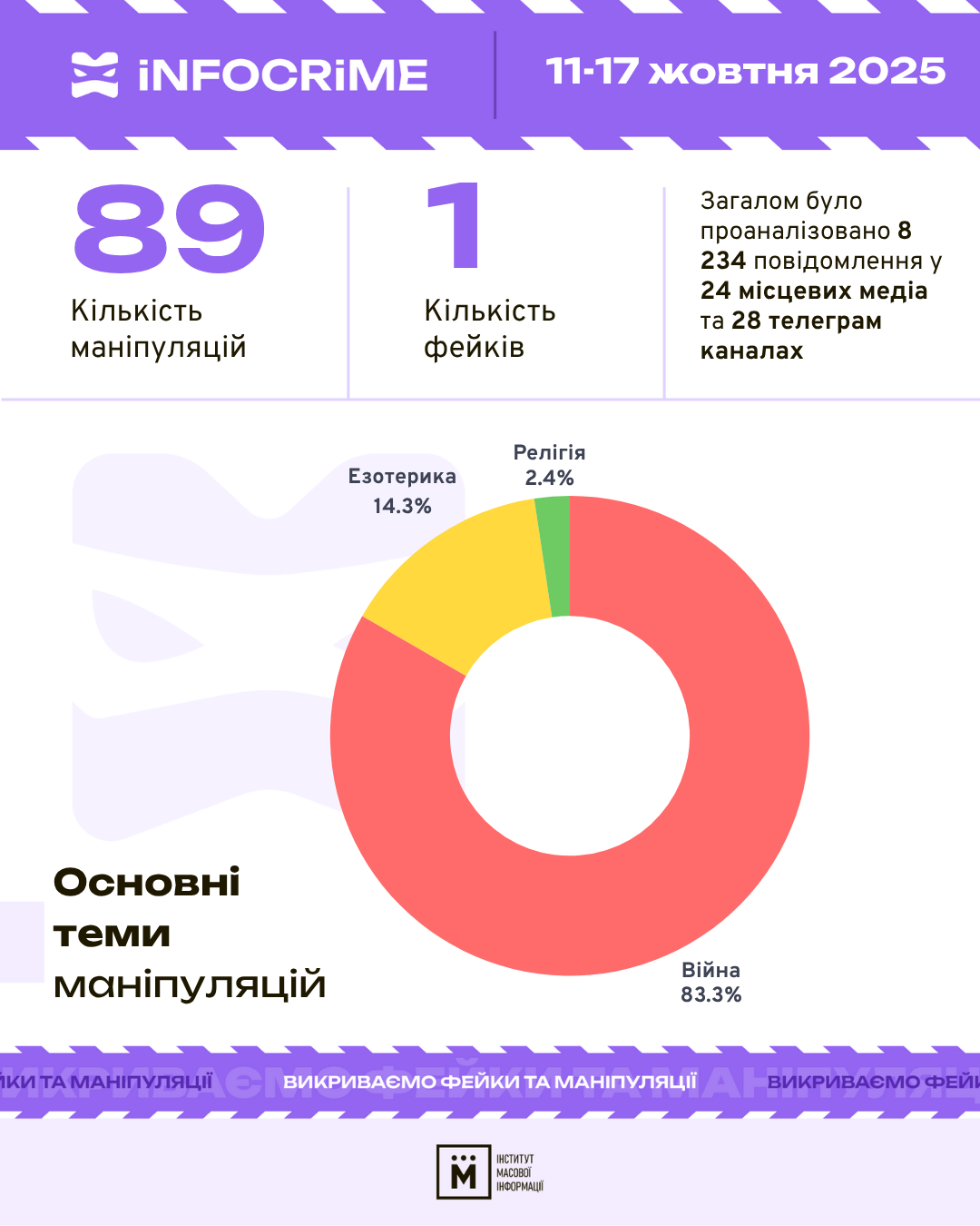 Маніпуляції на темі наслідків війни, на кшталт неіснуючих графіків відключення світла, введення в оману інформацією, яку неможливо перевірити (гороскопи та астрологія) — стали звичним явищем на телеграм-каналах та навіть у новинних стрічках полтавських медіа. Цього тижня ми зафіксували ще й маніпуляцію на темі релігії. «InfoCrime Poltava» проаналізував популярні медіа та пабліки Полтавщини протягом 11-17 жовтня, тож читайте щотижневий дайджест.