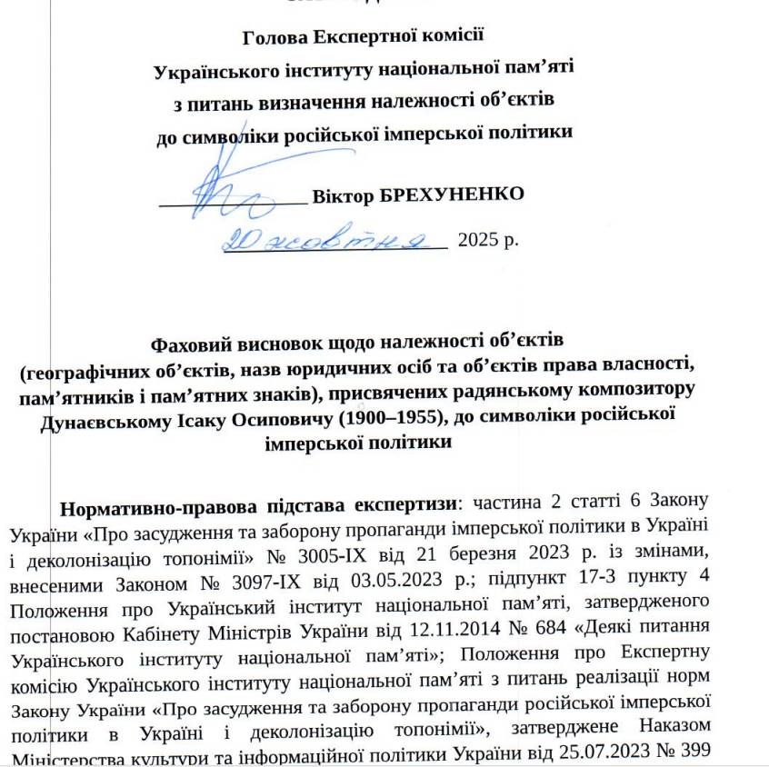 На офіційному сайті Українського інституту національної пам’яті (УІНП) оприлюднено фаховий висновок Експертної комісії УІНП щодо належності назв юридичних осіб тапам’ятників, присвячених совєтському композитору, уродженцю міста Лохвиця на Полтавщині Ісаку Дунаєвському, до символіки російської імперської політики.