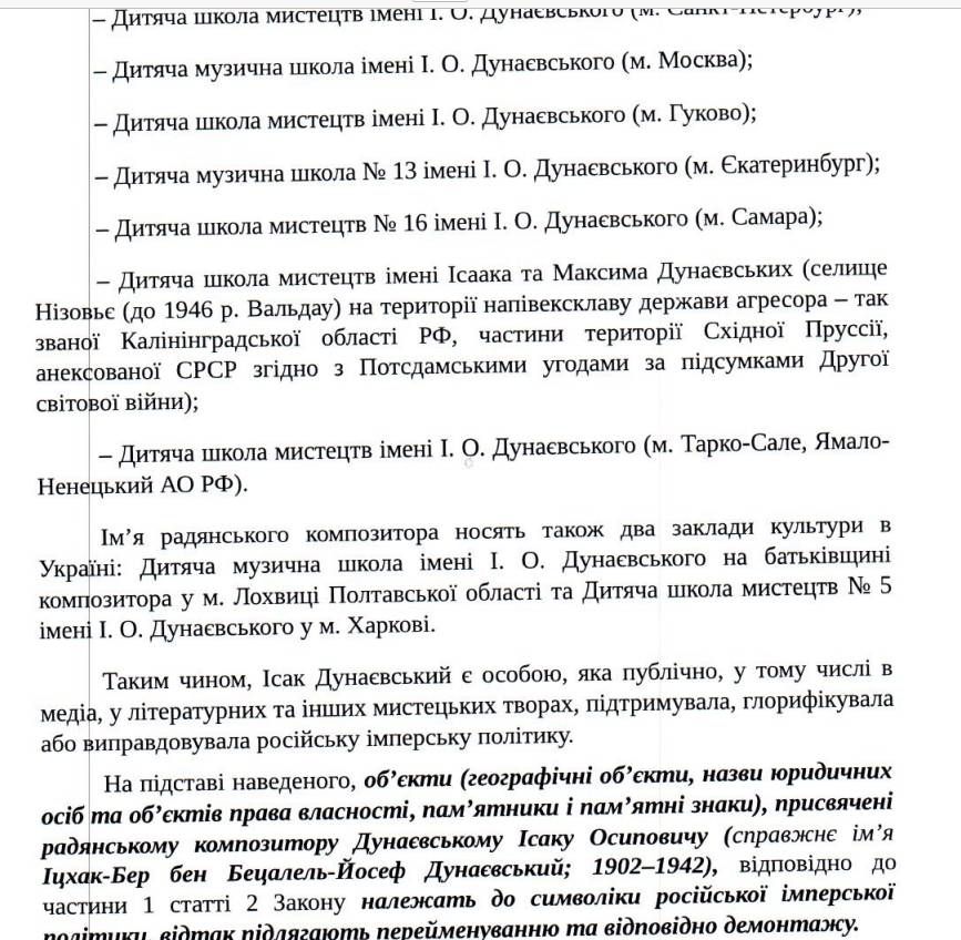 Зазначений документ є підставою для безумовного усунення імені Дунаєвського з публічного простору Лохвицької міської громади Миргородського району Полтавської області. Адже йдеться про автора пісень про СРСР, Сталіна та гімну столиці держави-агресора Москви. Необхідно демонтувати споруду звеличення (тобто так званий «пам’ятник-погруддя») Дунаєвському з центрального скверу міста Лохвиця. Також перейменувати Лохвицьку дитячу музичну школу ім. І.О.Дунаєвського.