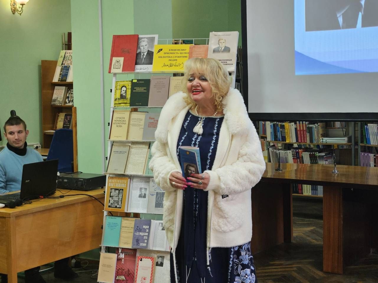 Директорка бібліотеки Валентина Орєхова запросила учасників дійства, здобувачів освіти, співробітників ознайомитися із книжковою колекцією відомого лінгвіста.