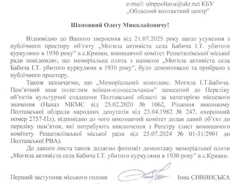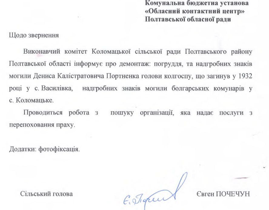 У селі Василівка, яке належить до Коломацької сільської ради Полтавського району було демонтовано об’єкт, який у реєстрі Міністерства культури мав назву «Голова колгоспу Дениса Калістратовича Портненка, що загинув у 1932 році від рук куркулів». Також з центральної зони села Кривки, яке належить до Решетилівської міської ради демонтовано меморіальну плиту «Активіст села Бабич І.Т., убитий куркулями в 1930 року». Демонтаж став можливим після того, як Міністерство культури своїм наказом «Про визнання такими, що не підлягають занесенню до Державного реєстру нерухомих пам’яток України, об’єктів культурної спадщини» позбавило ці комуністичні маркери відповідного статусу.