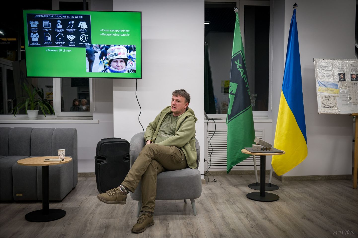 «Як народжується свобода. Історія українських Майданів» — таку назву мала лекція кандидата історичних наук, військовослужбовця Хорунжої служби «Хартії» Віталія Скальського. Також присутні ознайомилися із хронікою подій на Помаранчевому майдані та під час Революції Гідності. Серед іншого, було згадано і про полтавський вимір знакових подій історії України.