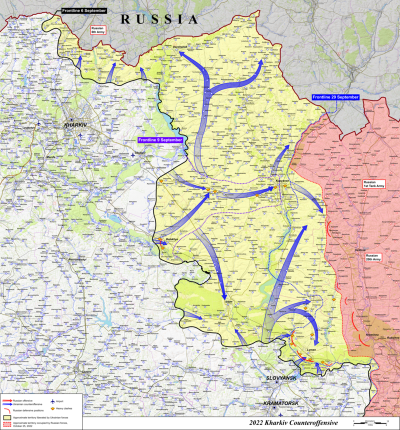 Харківська наступальна операція. На Слобожанщині 6 вересня наші сили спрямували основний удар Балаклію, Куп’янськ та Ізюм — міста, які були головними логістичними центрами окупантів. 8 вересня український прапор замайорів над Балаклією, 10 вересня — над Куп’янськом та Ізюмом. 12 вересня українські війська зайшли на територію міста Святогірська на півночі Донецької області. Експерти Американського інституту вивчення війни назвали звільнення Ізюма найбільшим військовим досягненням України після перемоги в битві за Київ. У ході цієї операції були повністю розгромлені підрозділи самарського і башкирського СОБР Росгвардії, 237-й гвардійський десантно-штурмовий полк, інші підрозділи армії окупантів. У середині жовтня ворог закріпився на рубежі Сватове — Кремінна. На той момент наші сили звільнили на Харківщині до 500 населених пунктів.