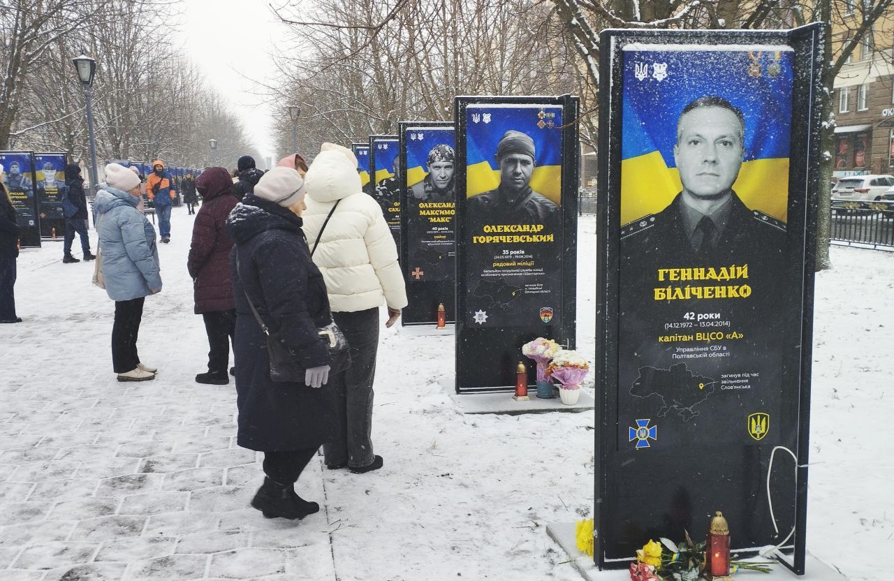 Друга зупинка — Каштанова алея на вулиці Соборності. Тут створена Алея Героїв «Полтава пам’ятає Героїв» Це одна із центральних магістралей Полтави і найстаріших вулиць. Мала назви — Успенська, Пробивна, Олександрівська, Жовтнева, з 2016 року Соборності — на вшанування ідеї соборності українських земель в Українській самостійній незалежній державі. У грудні 2024 року по обидва боки алеї встановлені щити з портретами полеглих героїв, які віддали свої життя в російсько-українській Війні за Незалежність, гаряча фаза якої триває з лютого 2022 року, а фактично має тяглість від боротьби за незалежність УНР на початку ХХ століття. Імена 360 Героїв/Героїнь на щитах. Вшануємо Героїв хвилиною мовчання. Полеглі Герої мають бути в публічному просторі, нагадуючи про ціну нашої свободи і державної незалежності. А ми повинні мати місце пам’яті про кожного і кожну, хто віддав життя за наші цінності та місце їх гідного вшанування. То ж пройдемо — підходьте, вдивляйтеся в лиця, читайте імена, прізвища, позивні. Яке псевдо зустрічається частіше? Звертайте увагу на вік, військові звання, нагороди. Чи є портрети захисниць?