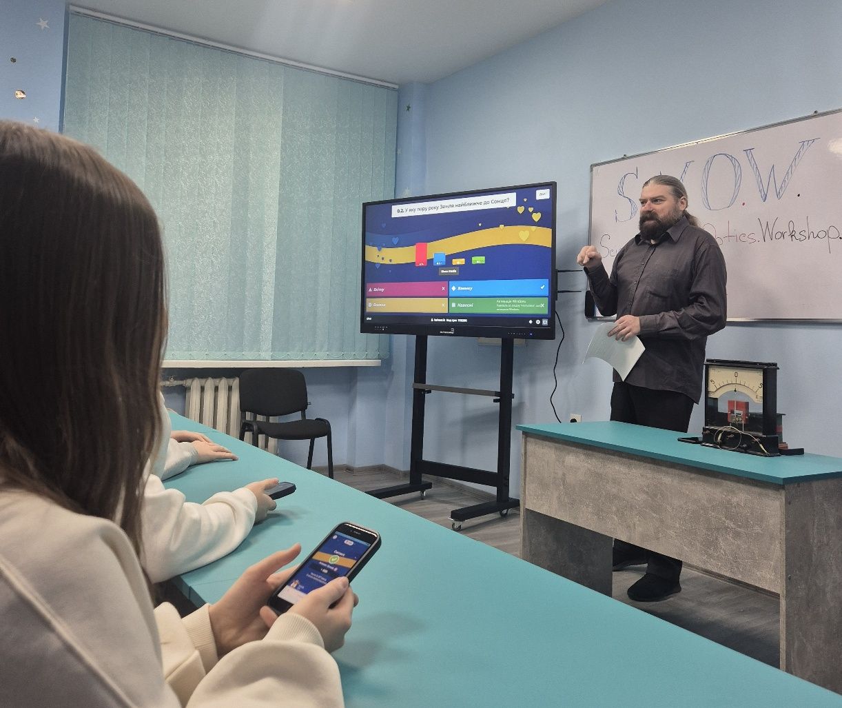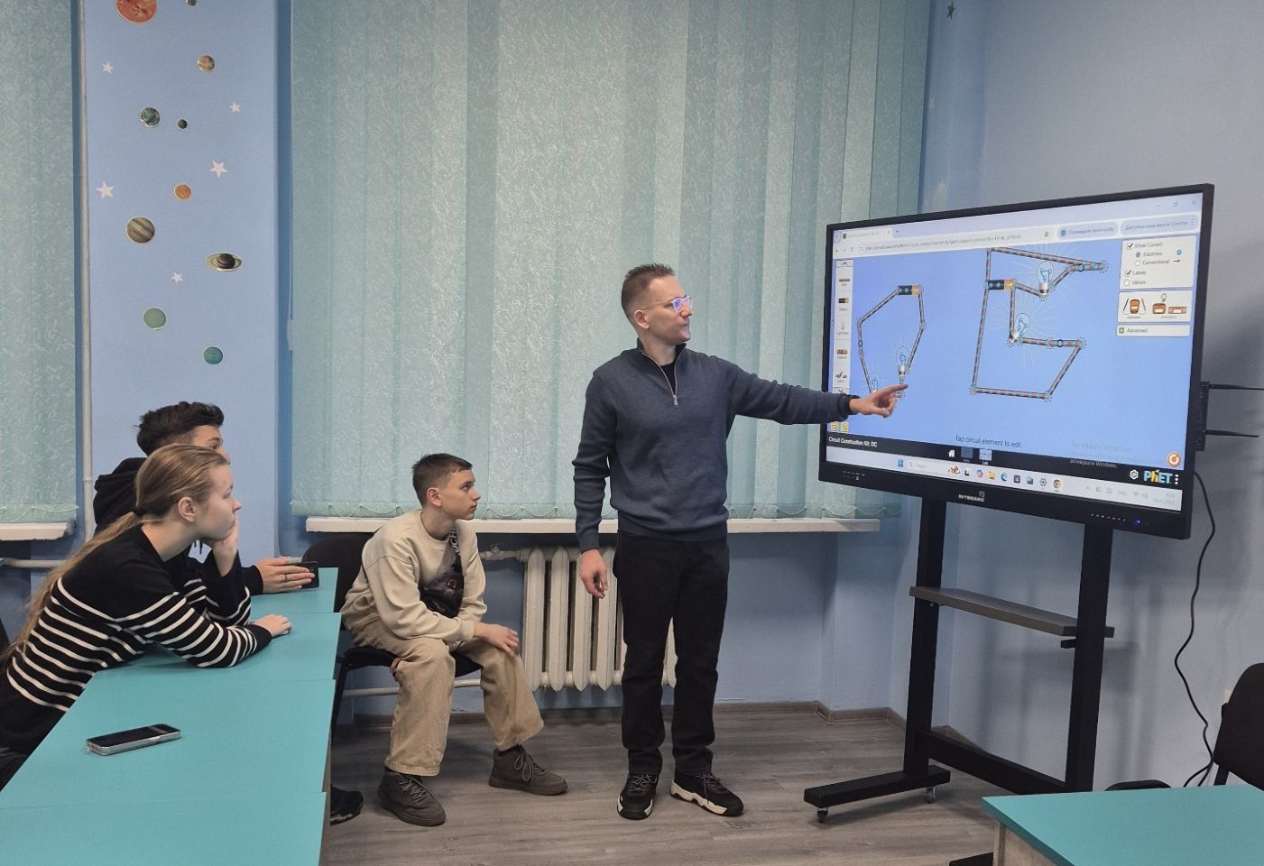 Жива демонстрація фізичних дослідів і можливості віртуальної лабораторії органічно поєдналися під час заняття, яке провів доцент Григорій Кузьменко. Школярі досліджували явище електромагнітної індукції, ознайомлювалися з його фізичною природою та історією відкриття, а також працювали з віртуальними моделями, складаючи електричні схеми й експериментуючи з їх параметрами.
