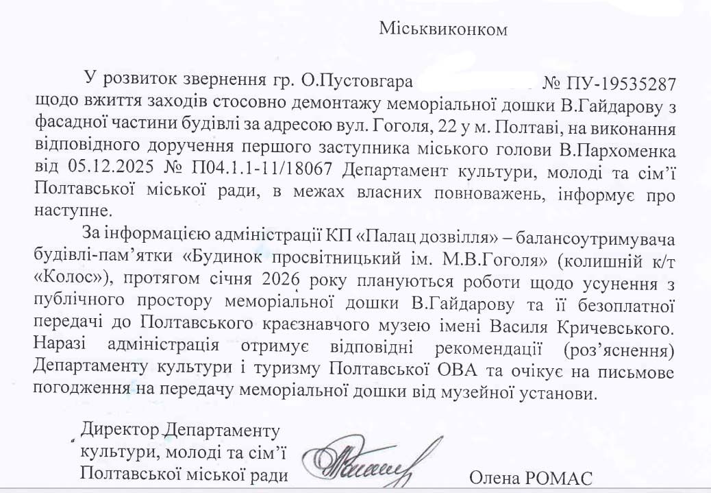 У межах виконання Законів «Про засудження та заборону пропаганди російської імперської політики в Україні і деколонізацію топонімії» та «Про засади державної політики національної пам’яті України» фасад полтавської історичної будівлі-пам’ятки по вул. Гоголя, 22 «Просвітницький будинок Гоголя» (колишній кінотеатр «Колос-Віззорія») цими днями очистили від меморіальної дошки барельєфного типу, яка глорифікувала російського імперського сталінського актора Гайдарова. Згідно з рекомендацій представника Українського інституту національної пам’яті в Полтавській області Олега Пустовгара, Департаменту культури і туризму Полтавської ОВА та Департаменту культури, молоді та сім’ї Полтавської міської ради демонтаж здійснило міське комунальне підприємство «Палац дозвілля» як балансоутримувач дошки. Барельєф у неушкодженому стані передано до фондів Полтавського обласного краєзнавчого музею імені Василя Кричевського.