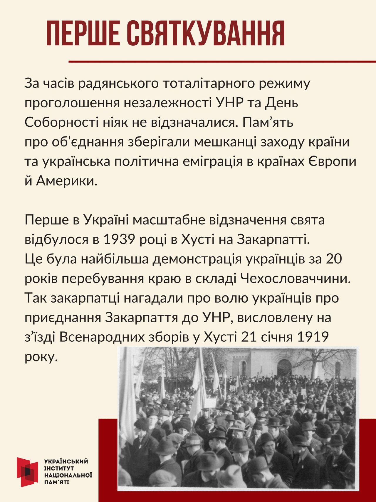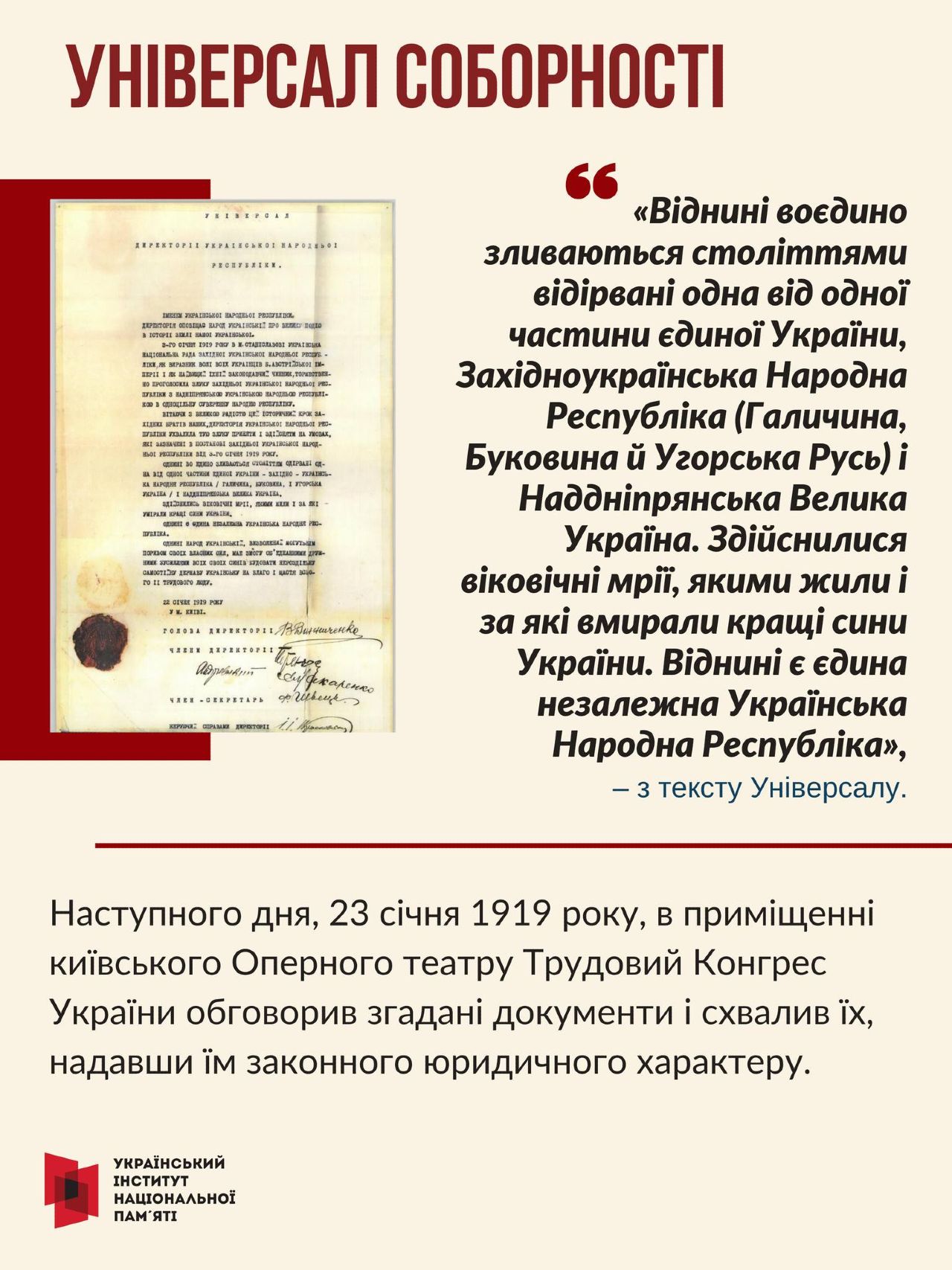 У зачитаному на зборах «Універсалі соборності», зокрема, відзначалося: «Однині воєдино зливаються століттями одірвані одна від одної частини єдиної України – Західноукраїнська Народна Республіка (Галичина, Буковина, Угорська Русь) і Наддніпрянська Велика Україна. Здійснились віковічні мрії, якими жили і за які умирали кращі сини України. Однині є єдина незалежна Українська Народна Республіка». Цій знаковій події українського державотворення, яка втілила соборницькі прагнення українців щодо консолідації в одній державі Український інститут національної пам’яті (УІНП) створив просвітницький слайдер.