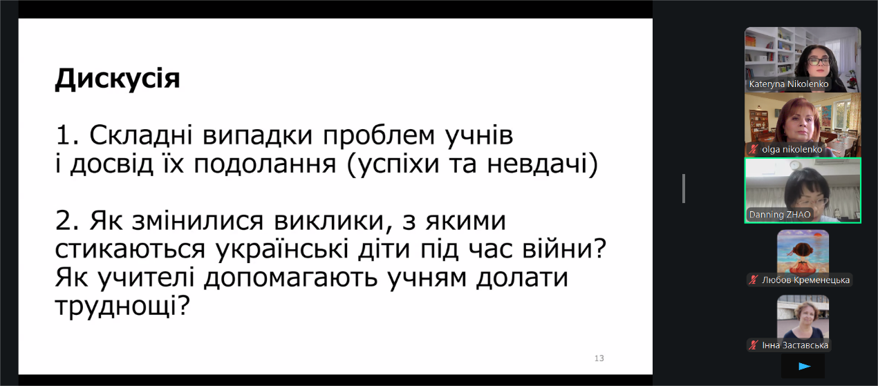 Тема дев’ятого тренінгу — «Психологічна підтримка для дітей, які проживають війну». Японська психологиня Danning Zhao розповіла про результати всеукраїнського опитування, що виявило негативний вплив війни на життя і навчальну діяльність дітей, а також поширені практики, які використовують українські вчителі для підтримки учнів.