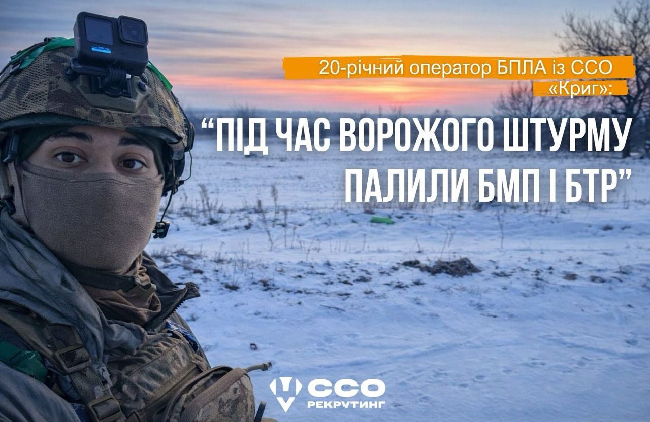 20-річний оператор БПЛА із ССО «Криг»: «Під час ворожого штурму палили БМП і БТР»