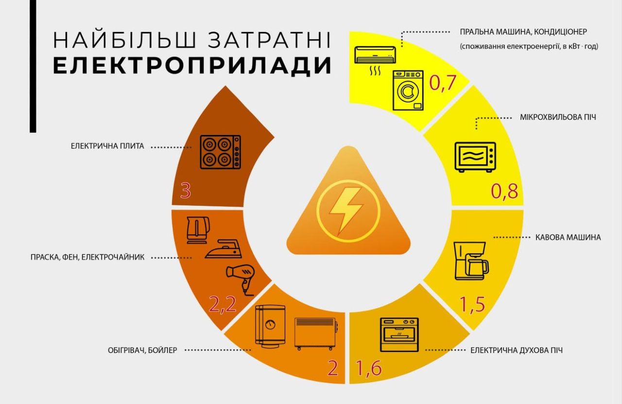 АТ «ПОЛТАВАОБЛЕНЕРГО» закликає мешканців області до ощадливого енергоспоживання протягом всієї доби. Не залишайте світло ввімкненим у приміщенням, де нікого немає. Не користуйтеся кількома електроприладами одночасно, бо це призводить до стрімкого зростання енергоспоживання. Електроустановки не розраховані на таке і не витримують різкого максимального збільшення електронавантаження. Тому не слід вмикати кілька електроприладів, особливо потужних, після того як з’явиться світло. Нагадуємо, які електроприлади є найбільш енергозатратними.