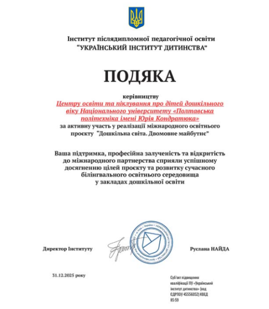 Національний університет «Полтавська політехніка імені Юрія Кондратюка» пропонує вступникам освітню програму «Дошкільна освіта», яка у 2025 році успішно пройшла акредитацію, що підтверджено сертифікатом Національного агентства із забезпечення якості вищої освіти.