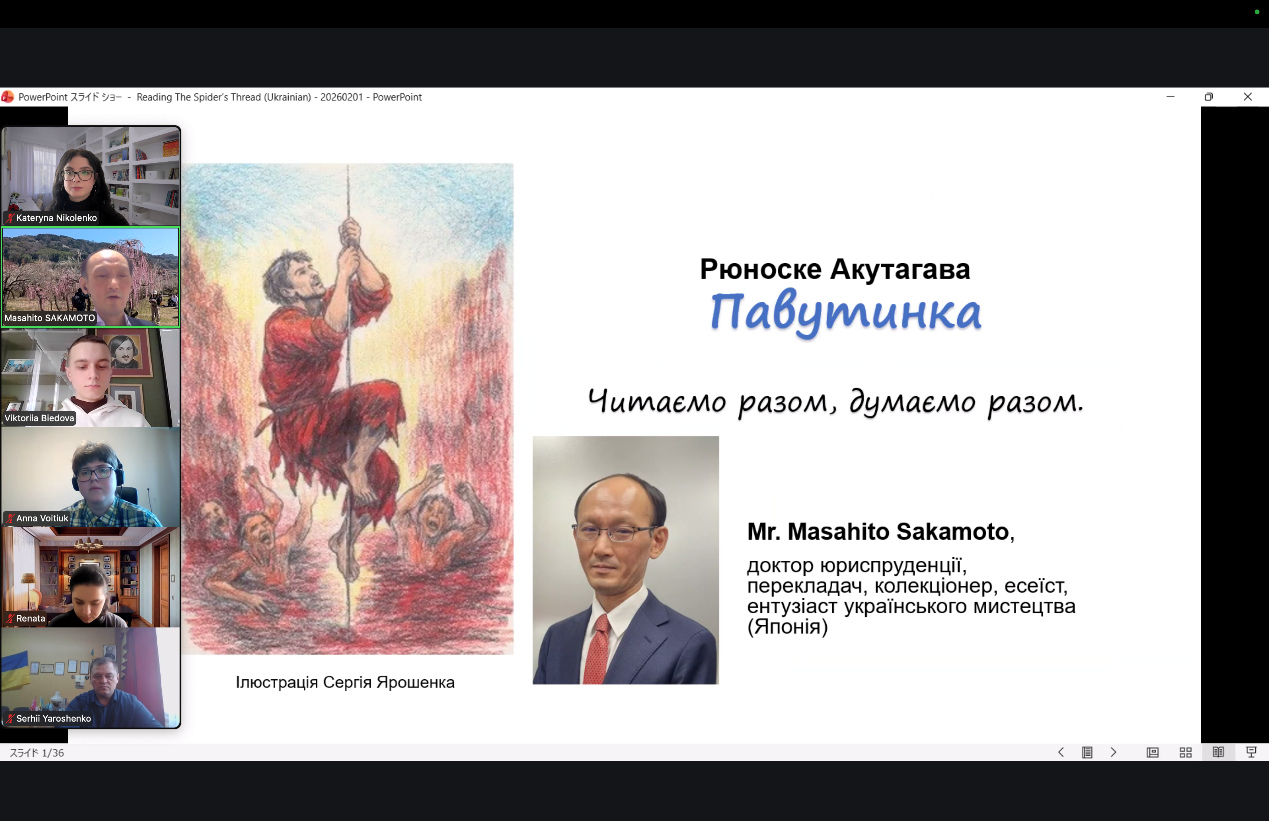 Під час лекції Mr. Masahito Sakamoto поділився своїми роздумами про новелу «Павутинка» Акутагави Рюноске. Він зауважив, що її не слід сприймати як суто повчальний твір або як доктрину буддизму. Це оповідання спонукає до роздумів та розмаїття інтерпретацій.