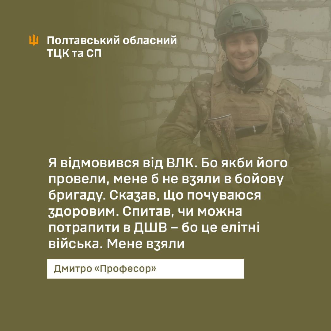 — Я відмовився від ВЛК. Бо якби його провели, мене б не взяли в бойову бригаду. Сказав, що почуваюся здоровим. Спитав, чи можна потрапити в ДШВ — бо це елітні війська. Мене взяли.