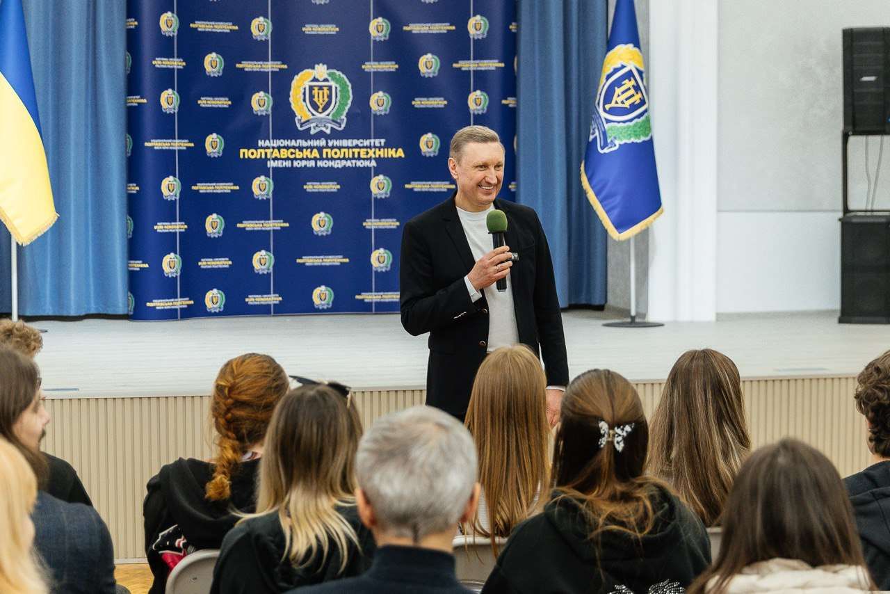 Досвідчений управлінець і стратег розвитку Володимир Онищенко не лише привітав абітурієнтів, а й став справжнім драйвером події, особисто презентувавши масштабну університетську екосистему можливостей. Він поділився з молоддю власною формулою успіху, прикладом здорового способу життя та надихнув на майбутні перемоги. Слова президента Полтавської політехніки стали справжнім мотиваційним імпульсом для всіх присутніх у залі, зарядивши майбутніх абітурієнтів упевненістю у власному виборі.