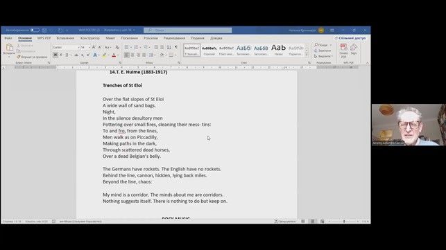 У своїй лекції професор Джеремі Адлер запропонував розлоге історико-літературне осмислення поезії війни — від античних текстів до сучасності — з особливим акцентом на поезії Першої світової війни. Науковець наголосив на еволюції художнього осмислення війни: від героїзації у давніх епосах до глибоко особистого й трагічного досвіду солдатів-поетів ХХ століття. Особливу увагу приділили ролі поета як свідка історичних подій і носія моральної рефлексії. Тема лекції особливо резонує з дисертаційною роботою викладачки кафедри романо-германської філології Лілії Солодкої, яка теж долучилася до цієї події.