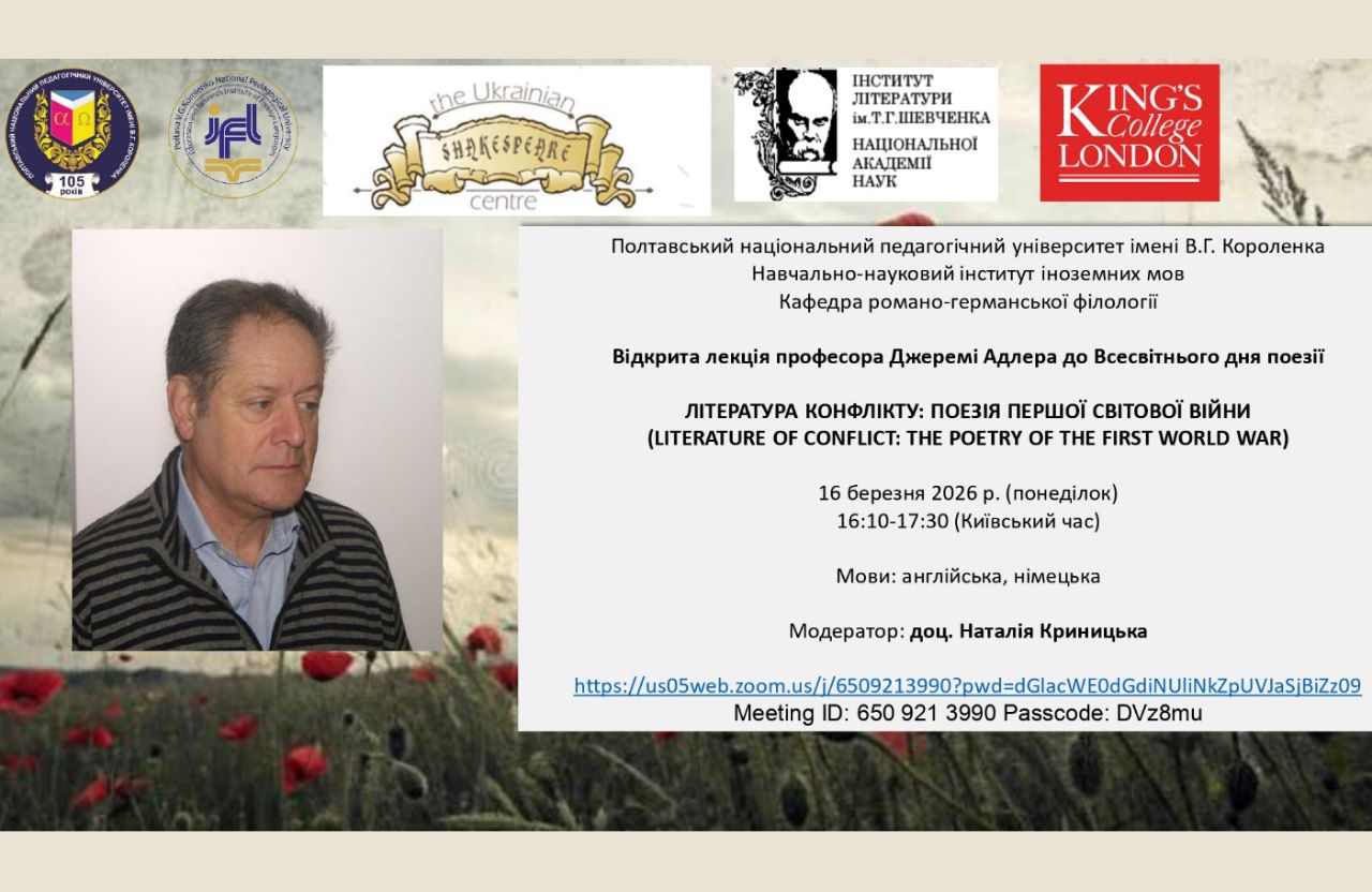 До Всесвітнього дня поезії, який відзначається 21 березня, в навчально-науковому інституті іноземних мов Полтавського національного педагогічного університету імені В. Г. Короленка відбулася відкрита міжнародна лекція «Literature of Conflict: The Poetry of the First World War» («Література конфлікту: поезія Першої світової війни»).
