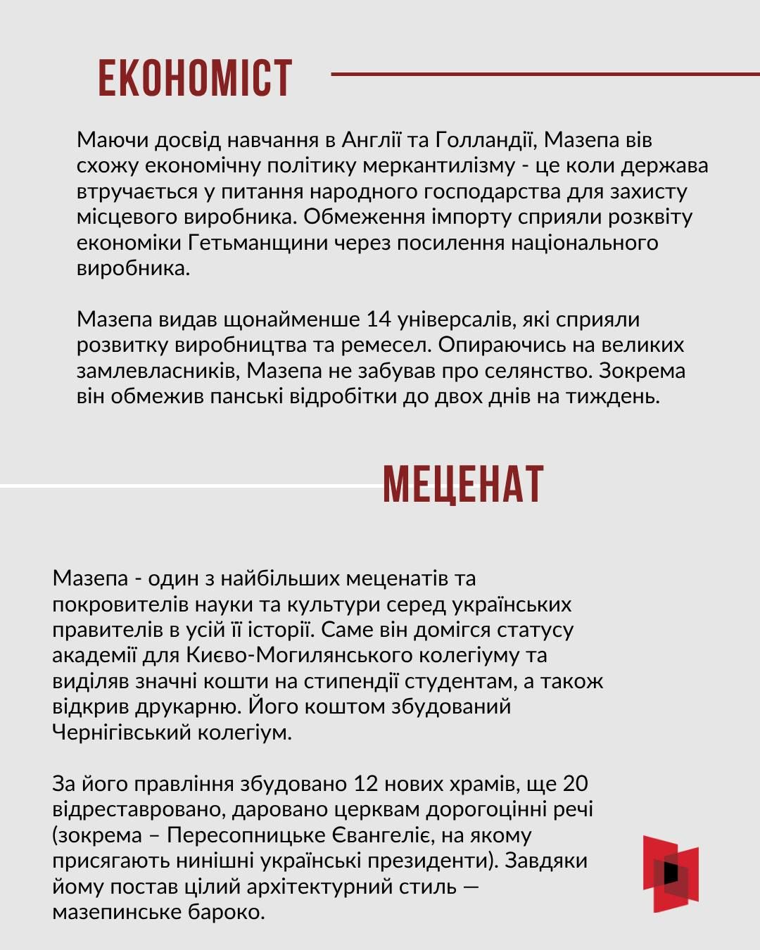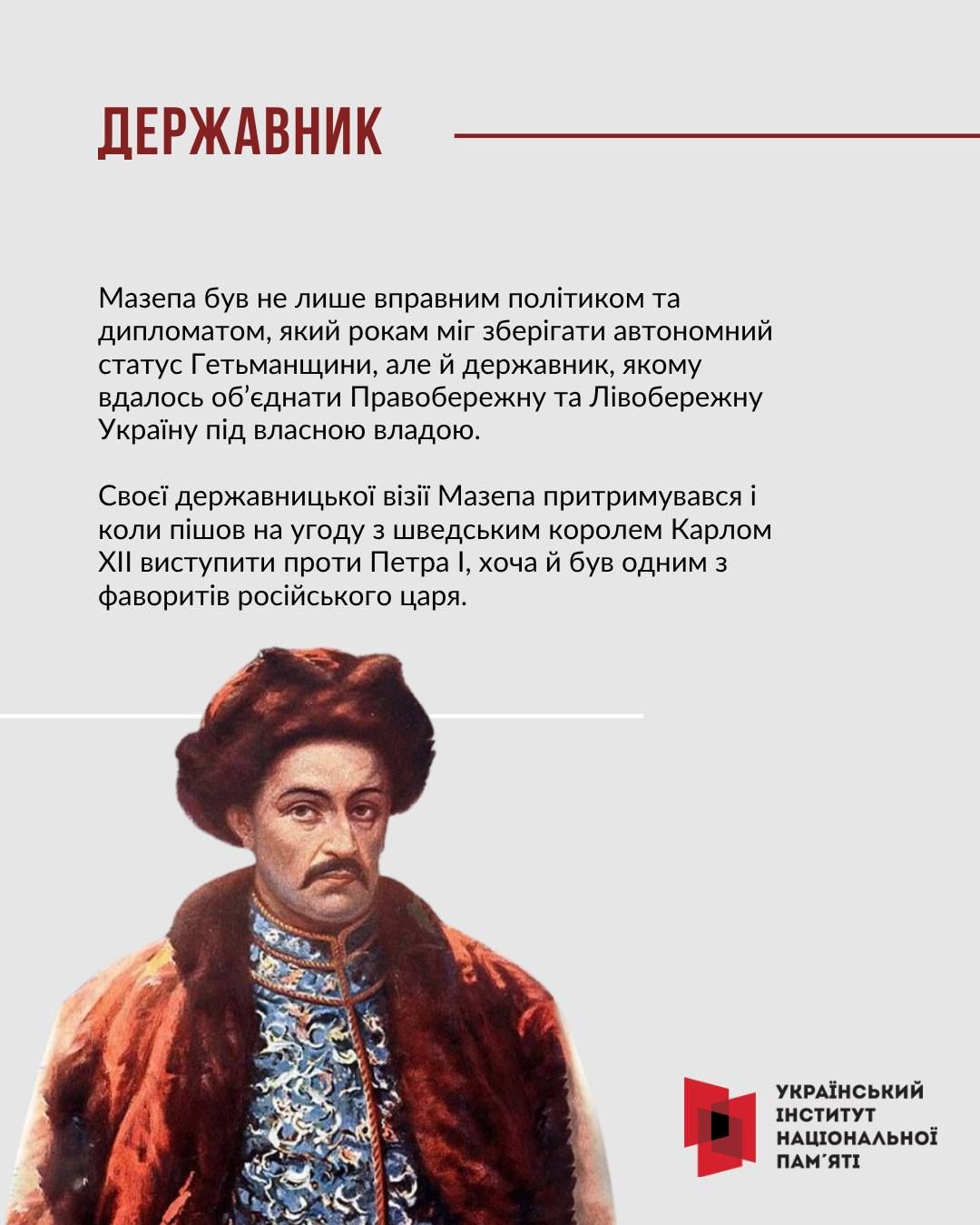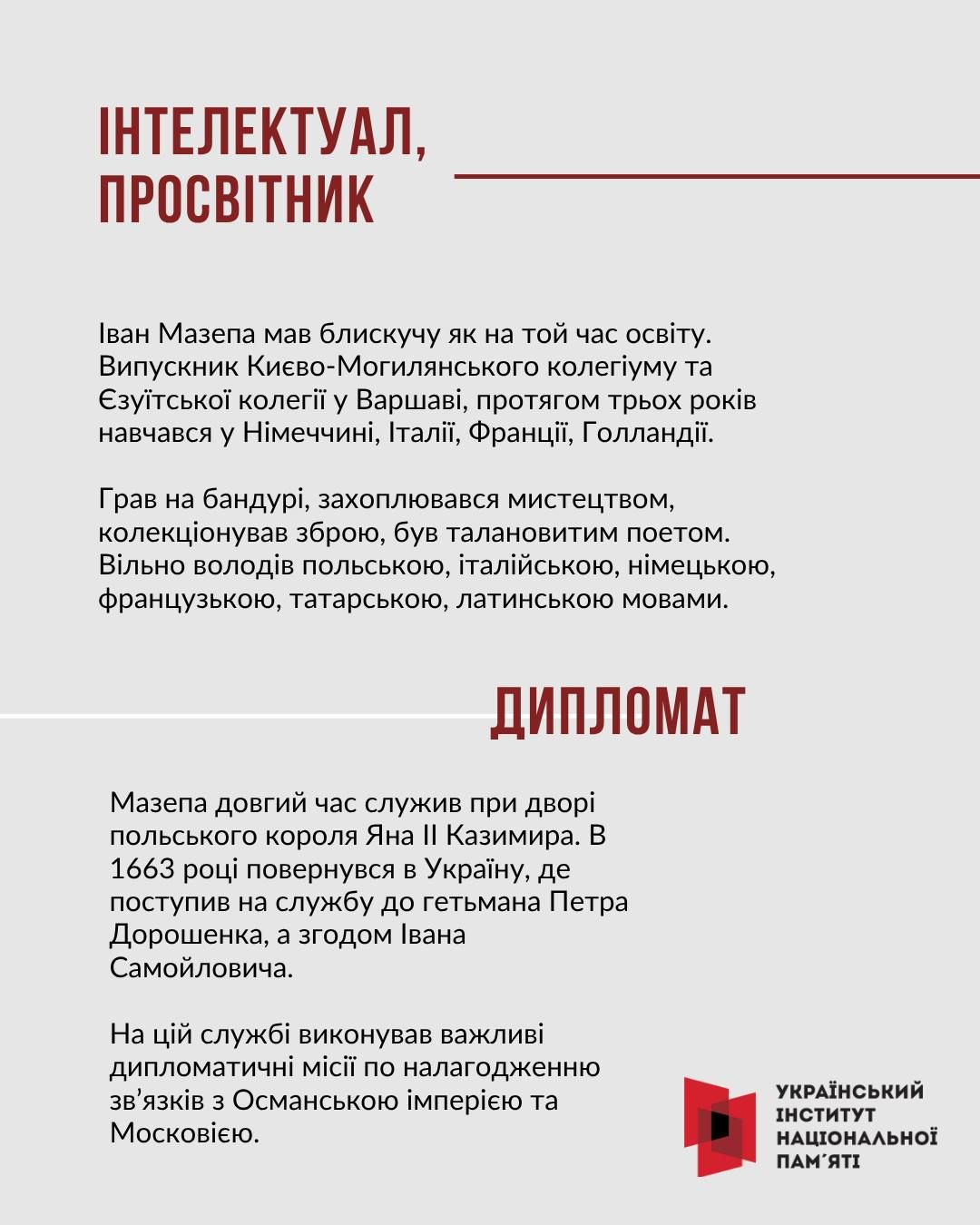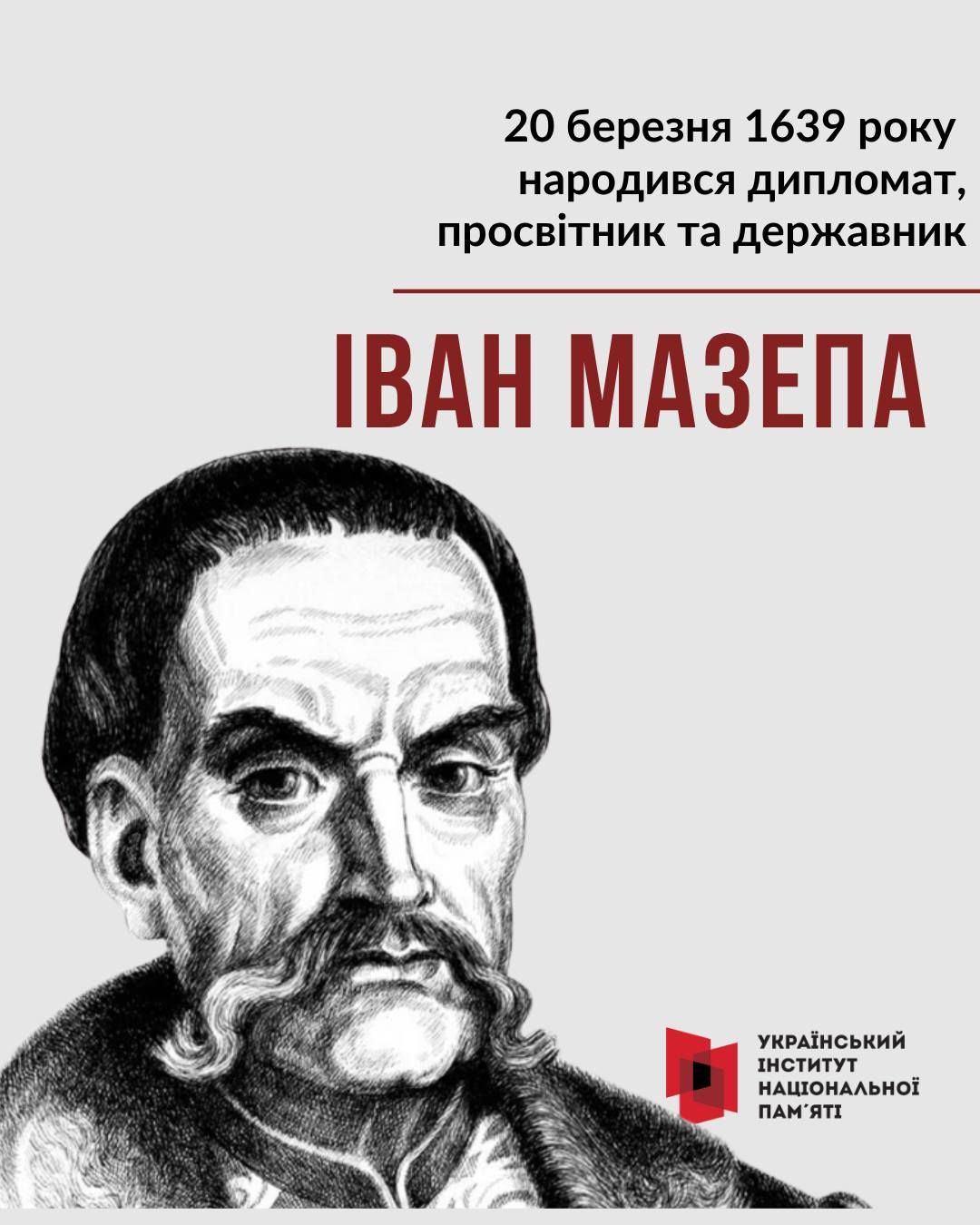 З нагоди 387-ої річниці від дня народження гетьмана Війська Запорозького, полководця, мецената, провідника антимосковського воєнно-політичного виступу Івана Мазепи — Український інститут національної пам’яті створив просвітницький інтернет-слайдер.