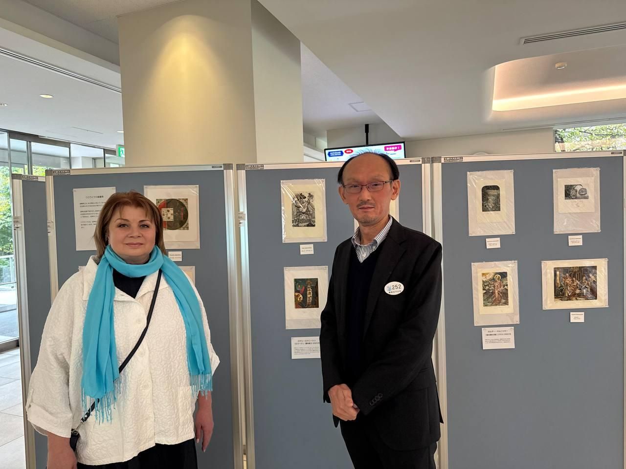 Професорка Ольга Ніколенко і Mr. Masahito Sakamotо біля виставки українських екслібрисів із його колекції. Сейсен Університет (Японія). 2025 р.