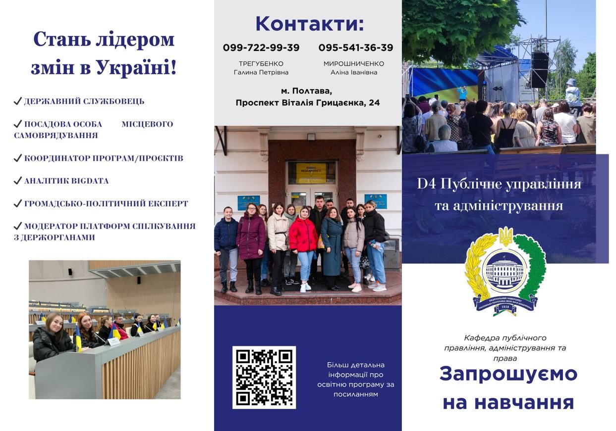 Запрошуємо на навчання за освітньою програмою «Публічне управління та адміністрування», адже нові знання – це нові горизонти! Працюючи в публічному управлінні, ви покращуєте життя мільйонів. Кожне ваше рішення – це новий міст, реформована лікарня чи прозора система закупівель. Це драйв від результатів, які помічаєш на кожному кроці, просто виходячи на вулицю. Ми чекаємо на тих, хто готовий стати новою елітою відновлення України!