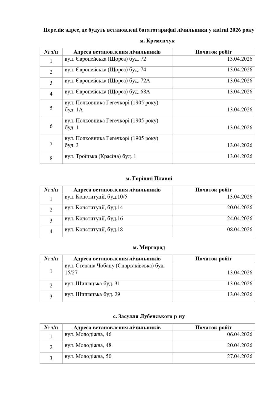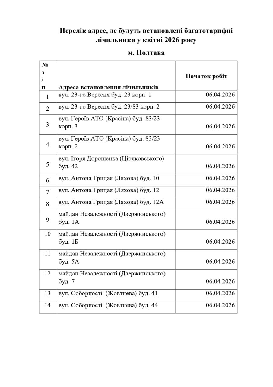 Перелік адрес, де будуть встановлені багатотарифні лічильники у квітні 2026 року: