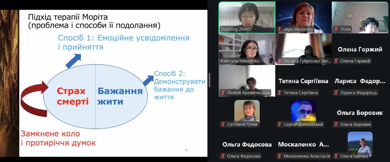 Координаторка психологічної служби міста Запоріжжя, голова Запорізької філії Міжнародної асоціації психологів та тренерів-експертів Любов Кременецька висловила подяку від імені комунальної установи «Центр професійного розвитку педагогічних працівників» Запорізької міської ради японській психологині Danning Zhao та викладачкам Полтавського національного педагогічного університету імені В. Г. Короленка за можливість відновлення психологічного здоров’я вчителів Запоріжжя з допомогою методів традиційної японської психотерапії (Моріта терапії).