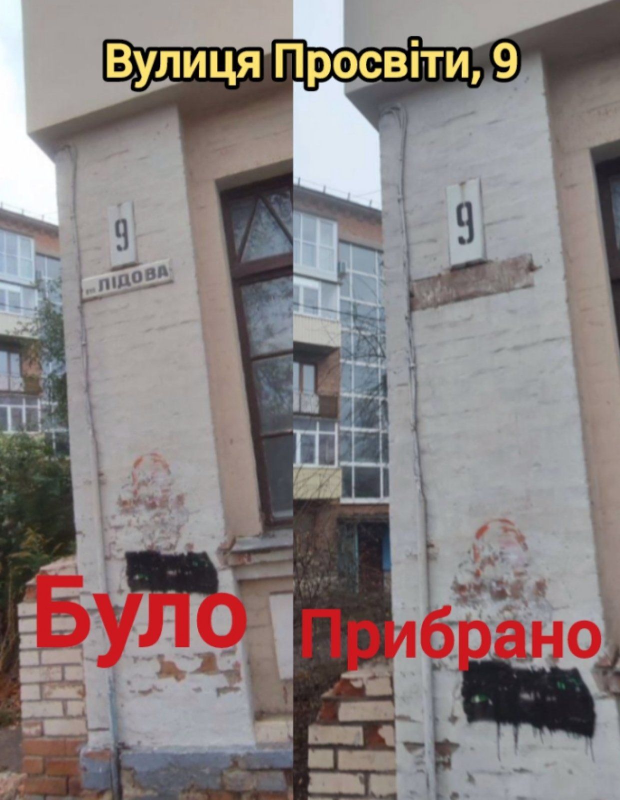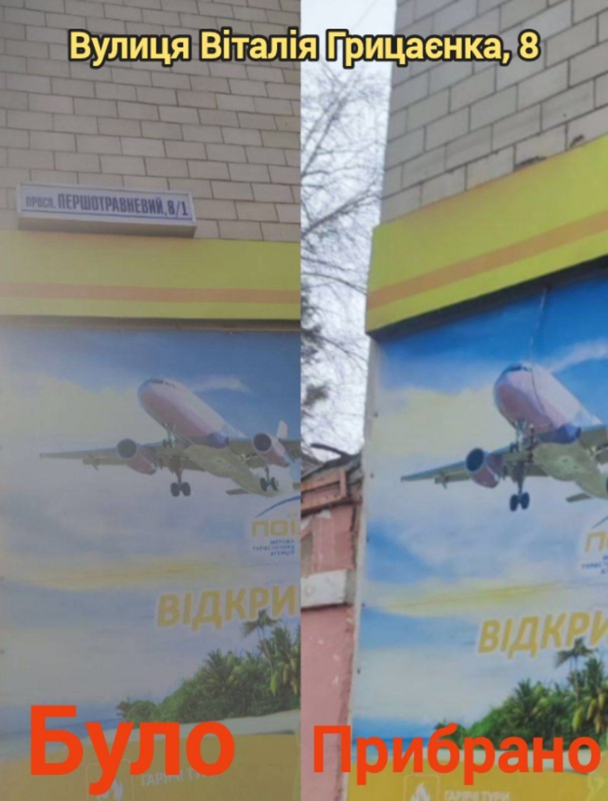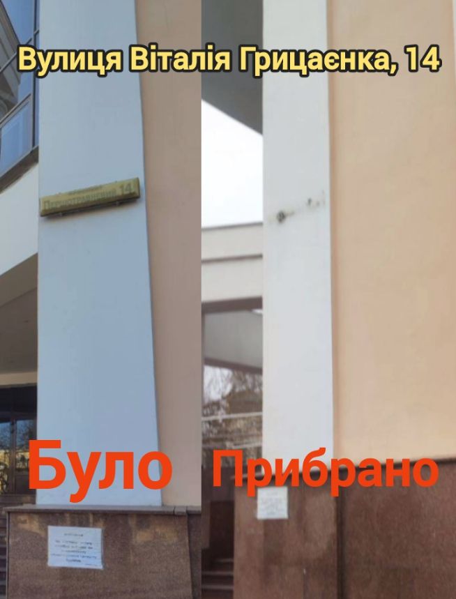 Будинки №8/1, №14, №19/2, по проспекту Віталія Грицаєнка очищено від написів-покажчиків «Першотравневий» (на світлинах).
