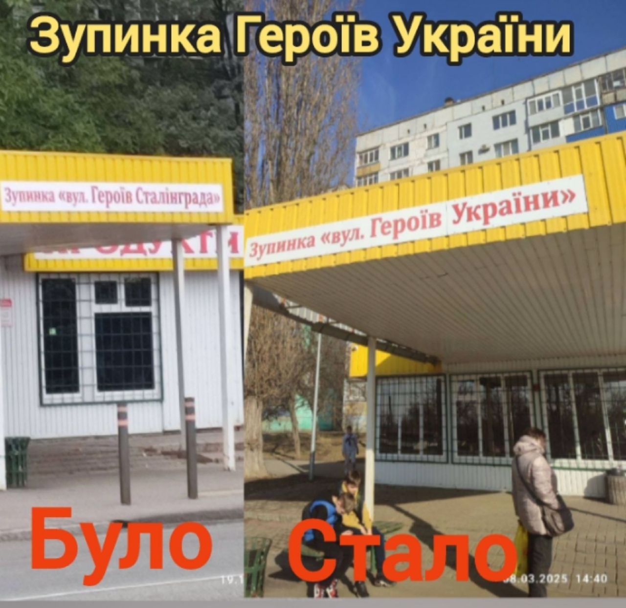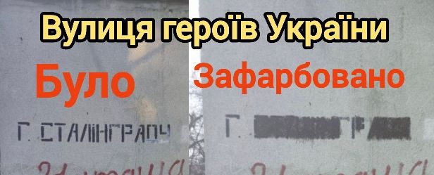 Впевнено рухається на смітник історії назва із іменем ката українського народу –Героїв Сталінграду. Як відомо, цю вулицю перейменовано на «Героїв України». Тож створено новий покажчик однойменної зупинки (на світлині) та замінено/зафарбовано написи на будинках №21, 24, 24-а по вулиці Героїв України.