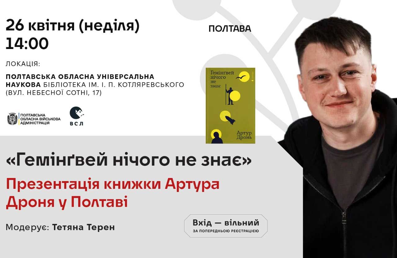 У неділю, 26 квітня, у Полтавській обласній універсальній науковій бібліотеці імені Івана Котляревського пройде зустріч із письменником та військовим Артуром Дронем.