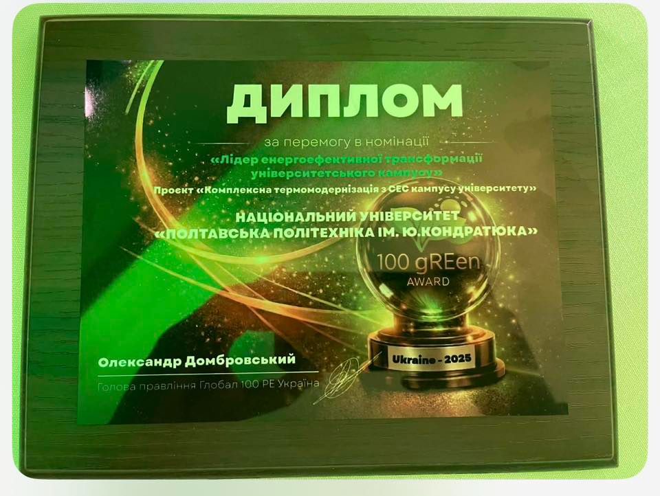 Полтавська політехніка — лідер енергоефективної трансформації: університет отримав престижну відзнаку 100 gREen AWARDS-2025