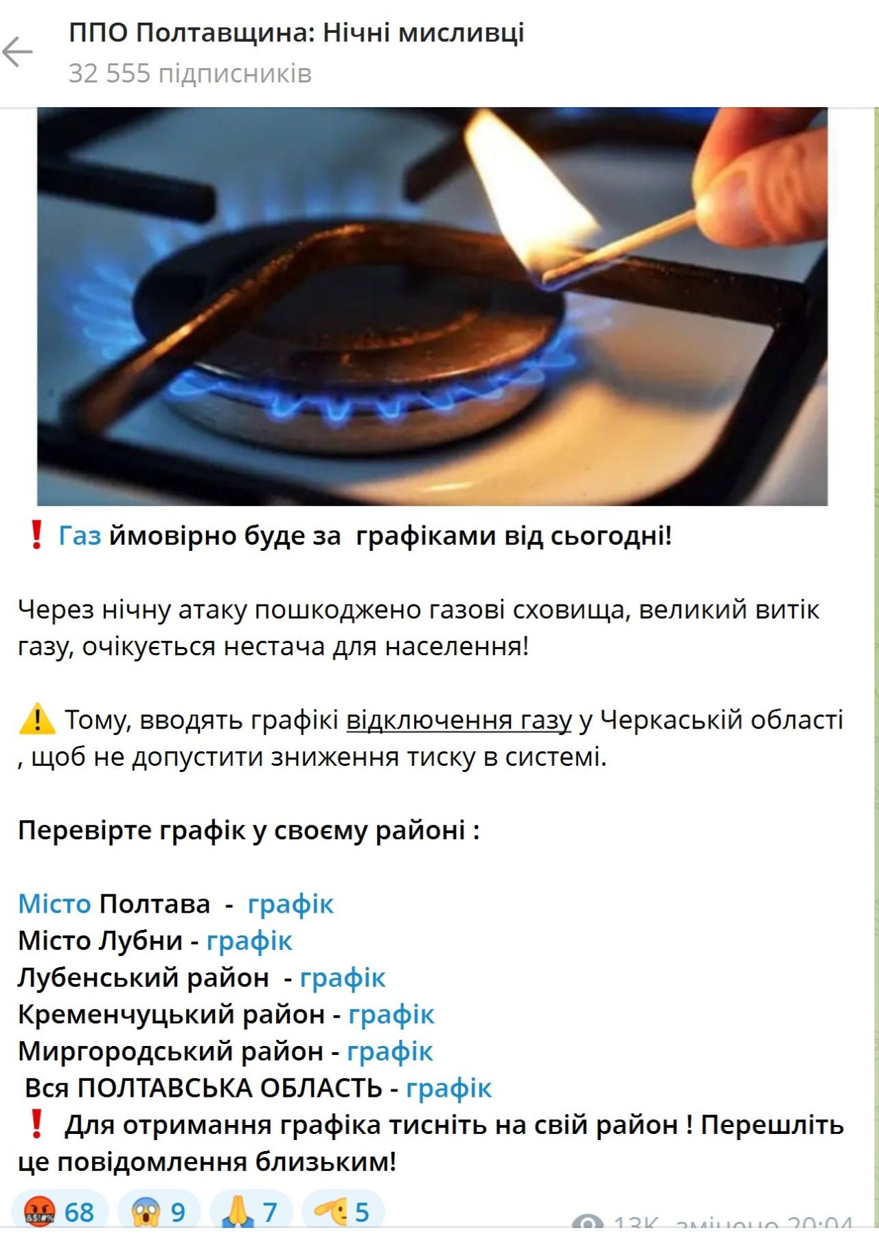 Інший паблік «ППО Полтавщина: Нічні мисливці» під виглядом неіснуючих графіків відключення газу публікував маніпулятивну рекламу неофіційного телеграм-каналу «єСвітло Полтавська область». Насправді на Полтавщині жодних графіків відключення газу немає станом на зараз.