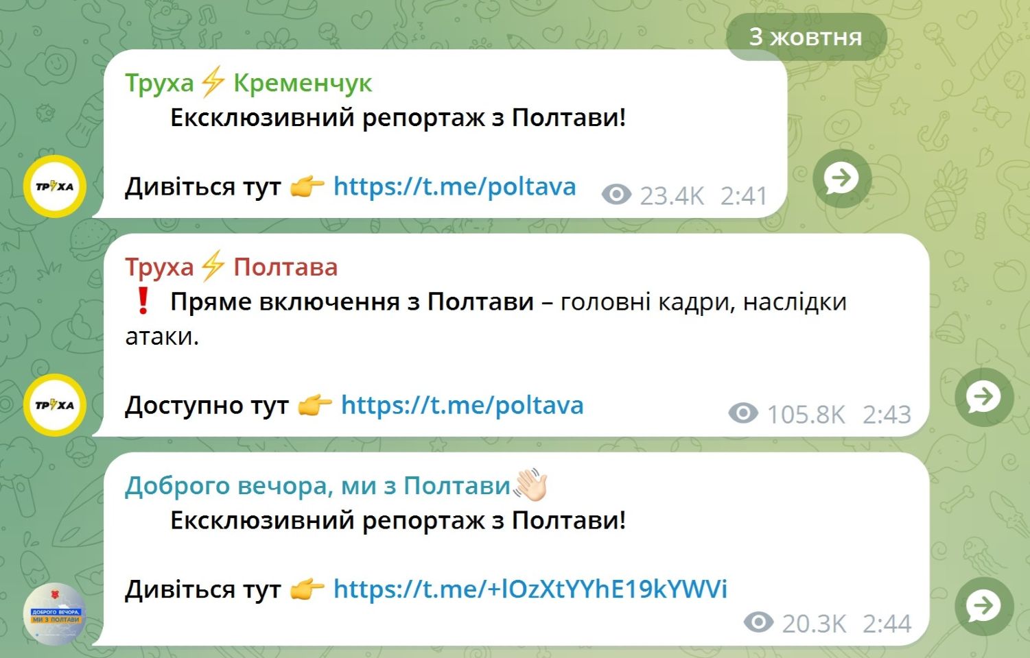 У ніч на 3 жовтня на Полтавщині стався один із наймасштабніших обстрілів за час повномасштабної війни. Росія завдала ударів ракетами та безпілотниками по низці об’єктів енергетики в області, пошкоджень зазнала цивільна інфраструктура у Полтаві. Місцеві телеграм-канали миттєво підхопили тему обстрілів, щоб використати це для маніпулятивної реклами інших телеграм-каналів.