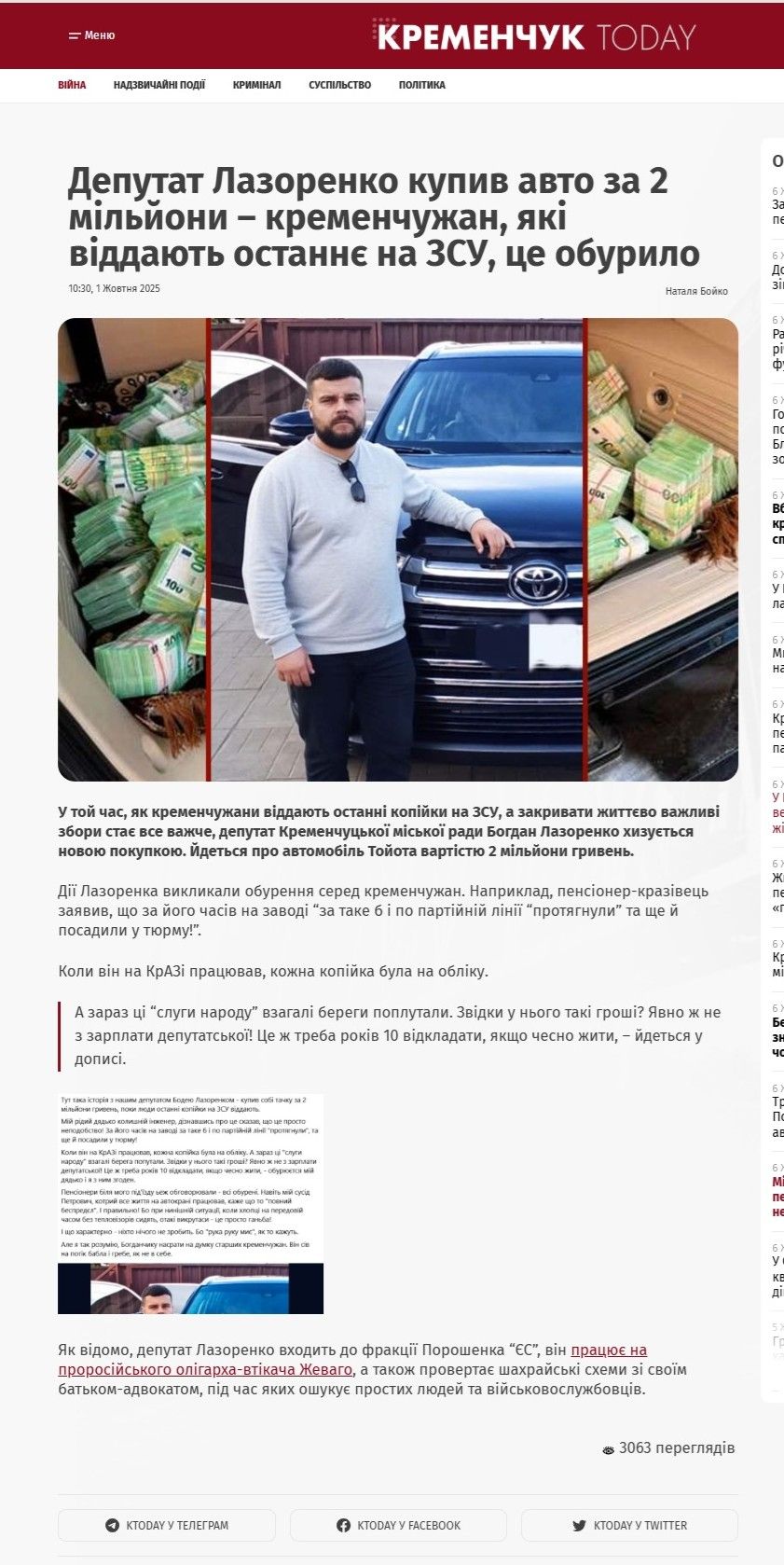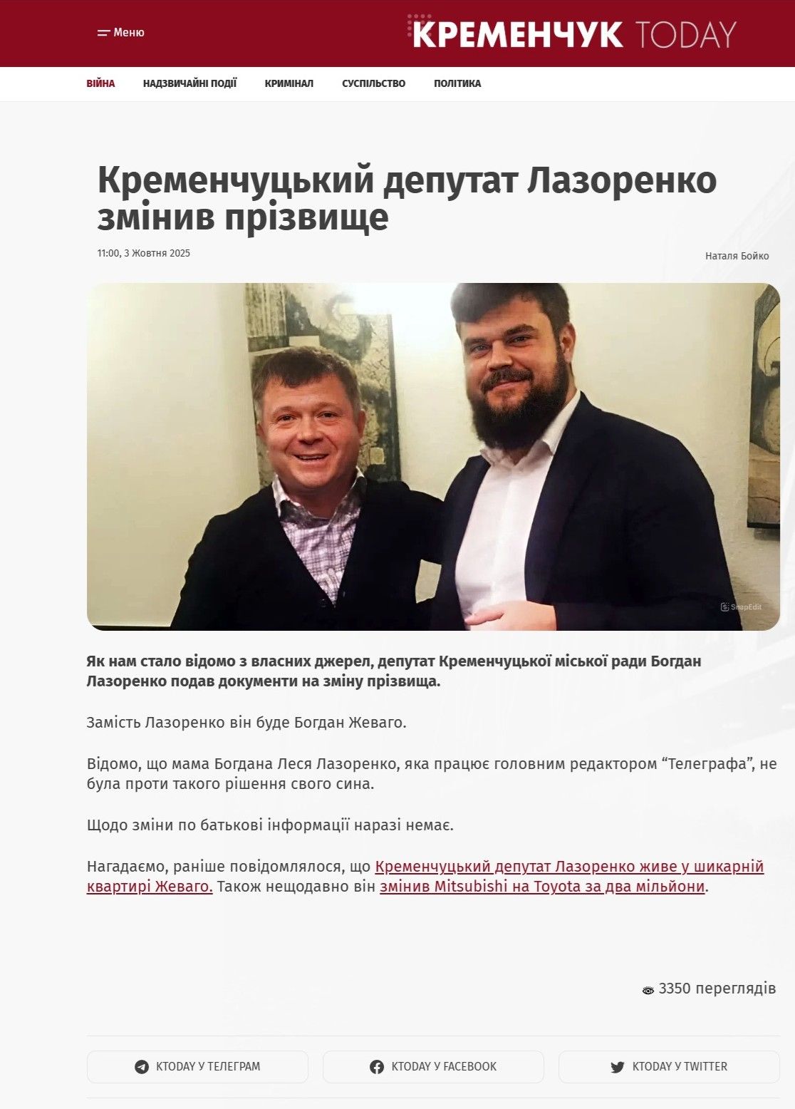 Також на сайті «Кременчук Today» вийшли три маніпулятивні та з ознаками фейку новини про депутата Кременчуцької міської ради Богдана Лазоренка.